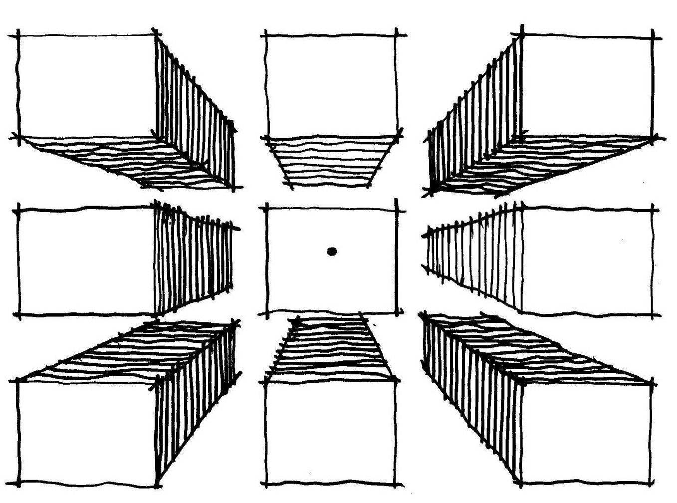 (1)一点透视。一点透视即整个画面当中只有一个灭点的透视。其特征是,在实际生活空间中,原先垂直于视平线的线条在画面中依然保持垂直;原先平行于视平线的线条依然保持平行;其余线条相交于一个灭点。按照一点透视规律,其可以归纳为九种类型,即仰视三种、平视三种、俯视三种,各种类型的转换主要取决于人和物体的相对位置关系。
