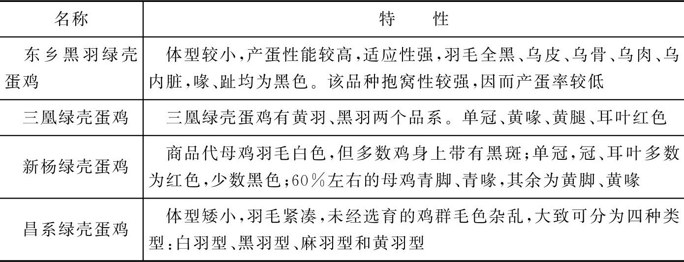 绿壳蛋是由遗传基因决定的。从营养上绿壳蛋和普通白壳蛋、褐壳蛋无区别,但是由于市场上比较少见,且鸡的生产性能低,所以价格较高。生产中有多个品种,见表2-5。