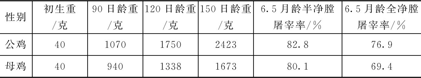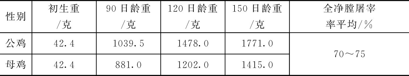 150日龄公、母鸡平均体重,在福建分别为1460克、1370克,在江西分别为913.8克、851.4克。半净膛屠宰率,公鸡为88.35%,母鸡为84.18%;全净膛屠宰率,公鸡为75.86%,母鸡为69.5%,显著高于一般肉鸡,并且肉质细嫩,肉味醇香。