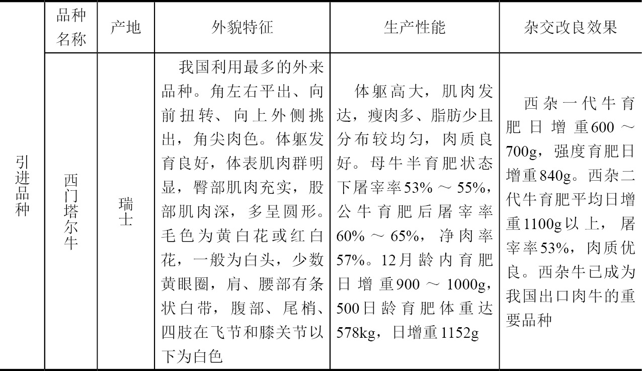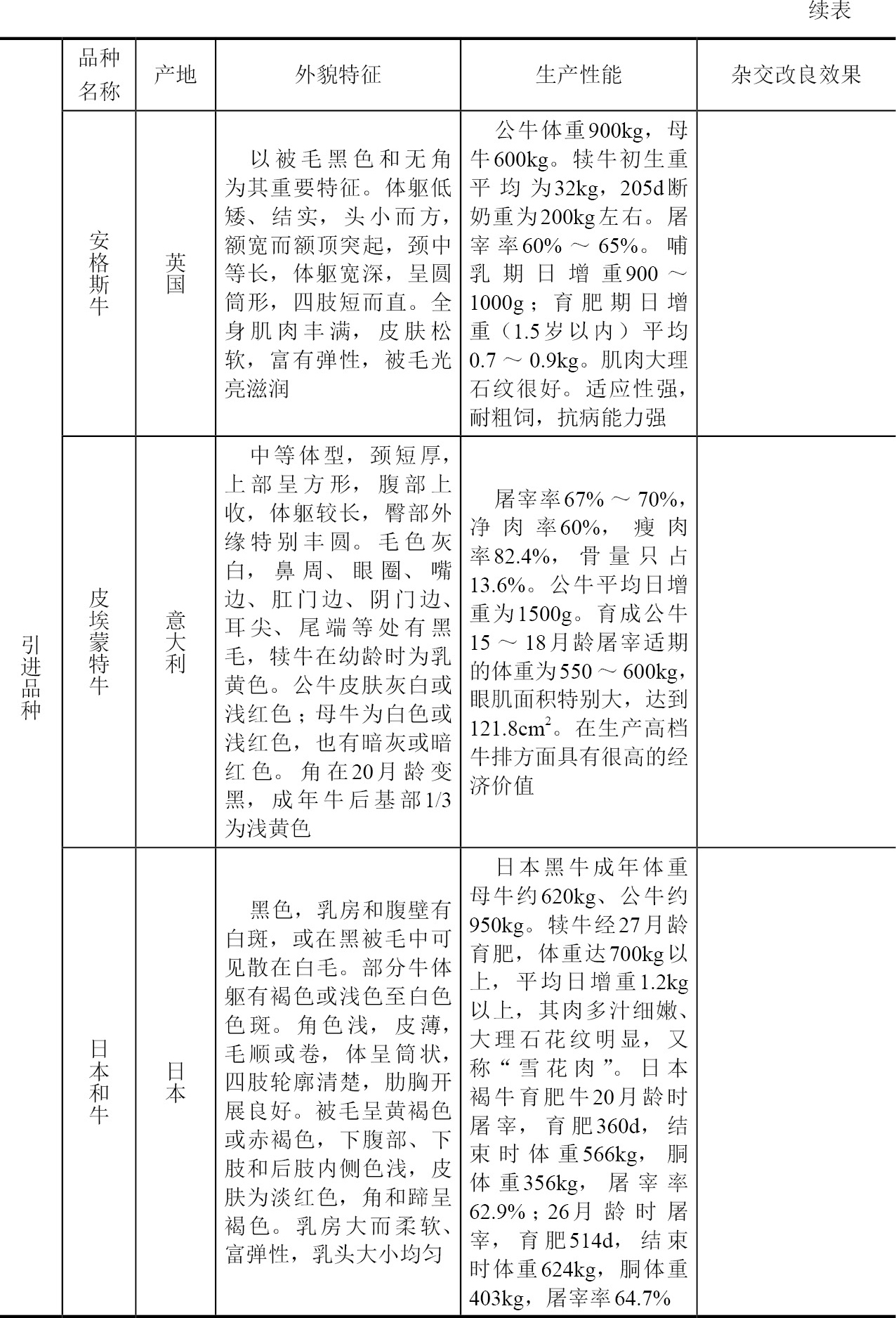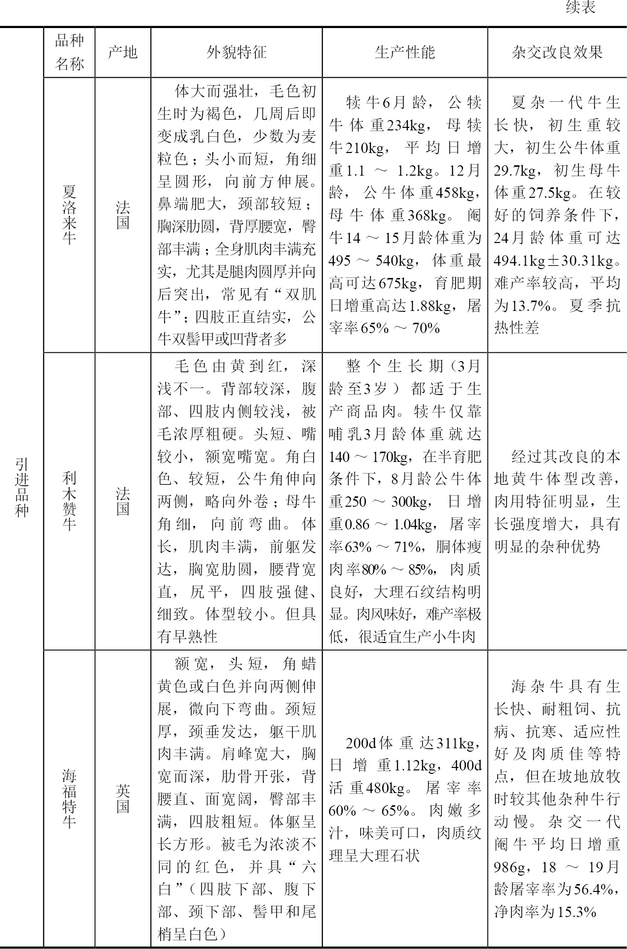 目前,常见的国内外优良肉牛品种见表2-1。在我国饲养较多的是西门塔尔牛、利木赞牛、夏洛来牛、安格斯牛等及其杂交牛(与本地牛的二元或三元杂交)。