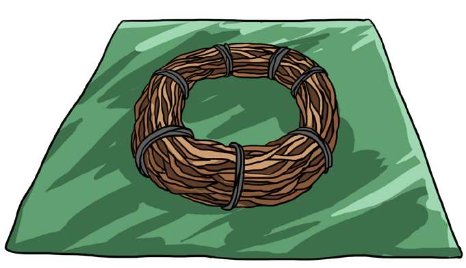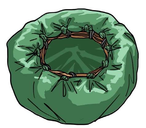 (4)把雨披铺在地上,里面朝上,再把编好的树枝圆圈放到雨披中央,用雨披把圆圈裹起来,将雨披上的扣眼扎紧。
