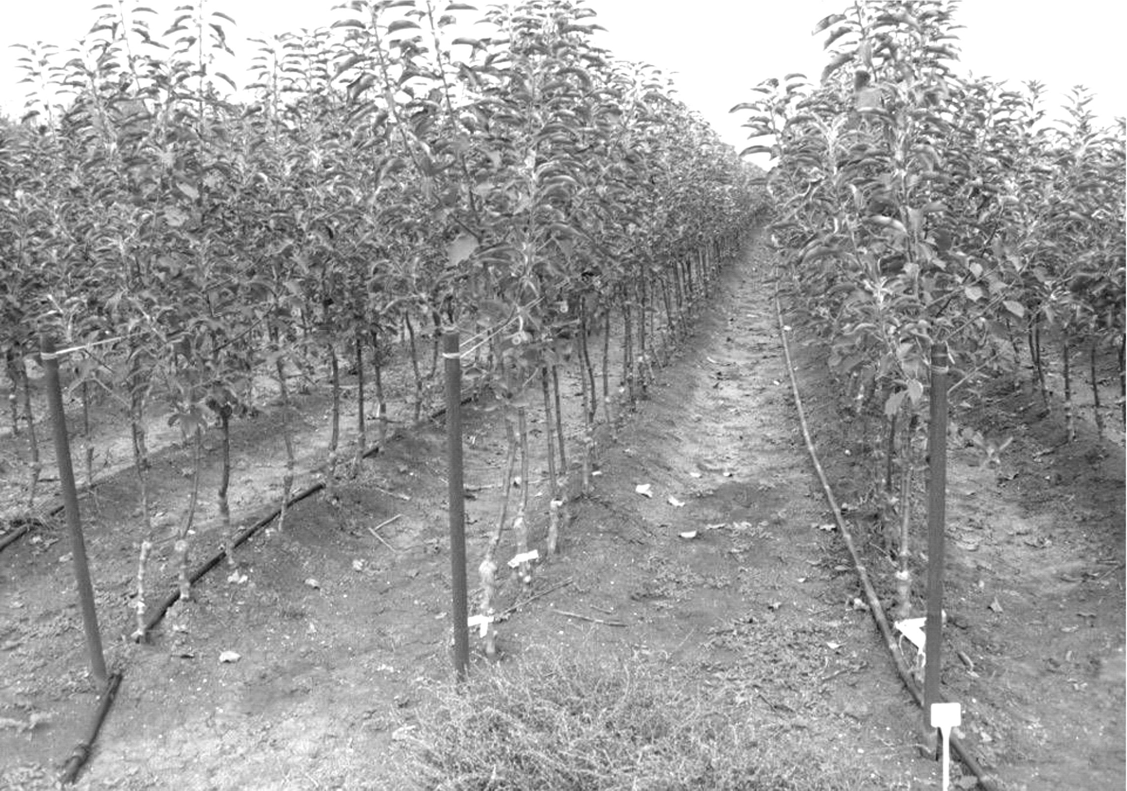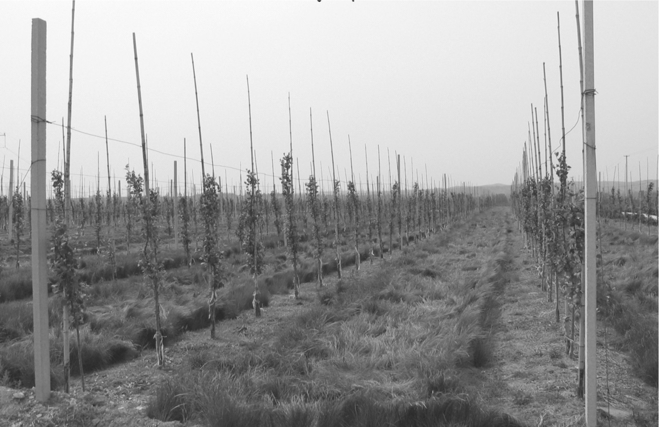 加快发展苹果矮砧、集约化高效栽培模式,促进现代苹果栽培制度的建立。今后5~10年,中国苹果处于大规模更新换代的关键时期,要紧紧抓住这一良好的历史机遇期,实施老果园更新换代工程,新建果园推广苹果矮砧集约高效栽培技术模式,逐步实现由乔砧密植栽培向宽行矮砧集约高效栽培的转变,加快推动苹果栽培制度的变革和现代生产制度的建立,实现苹果的省工、省力、集约、高效和标准化生产。在平原或具有很好的水浇条件或能配备水肥一体化设施、适宜矮砧发展地区,要积极发展M9T337等“矮砧、宽行、高干、集约、高效”栽培模式(图1-3、图1-4,彩图)。