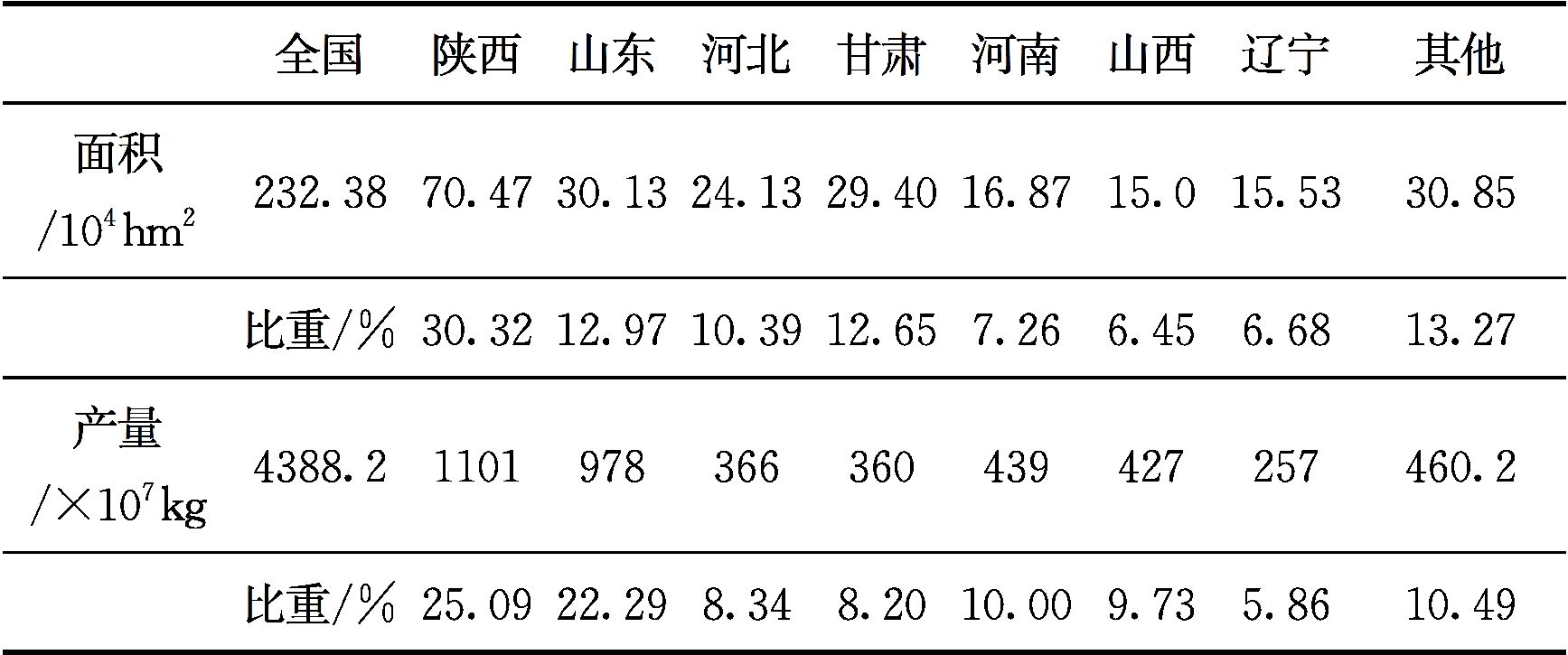 2016年,中国苹果种植面积2.32×10 6 hm 2 ,产量4.39×10 10 kg。