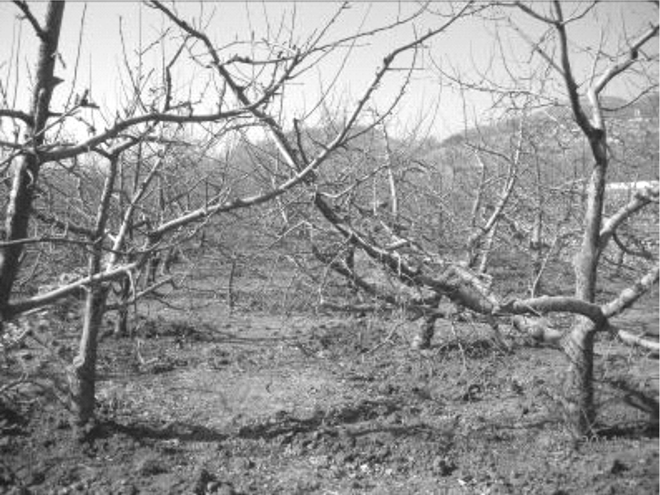 由于采用乔砧密植栽培制度,多数苹果园树体生长旺、树势难控制、栽培技术复杂、结果晚,果农对乔砧密植栽培技术掌握和执行不到位,加之该模式自身的缺陷,造成大多数果园树体高大、枝量多、树冠密闭、内膛光照不良,生产条件逐步恶化,致使果实产量低、果实内在品质下降、优质高档果品比例低的问题十分突出(图1-1,彩图)。应该采用隔行间伐、缩冠提干、以小换大等技术进行郁闭园改造(图1-2,彩图)。