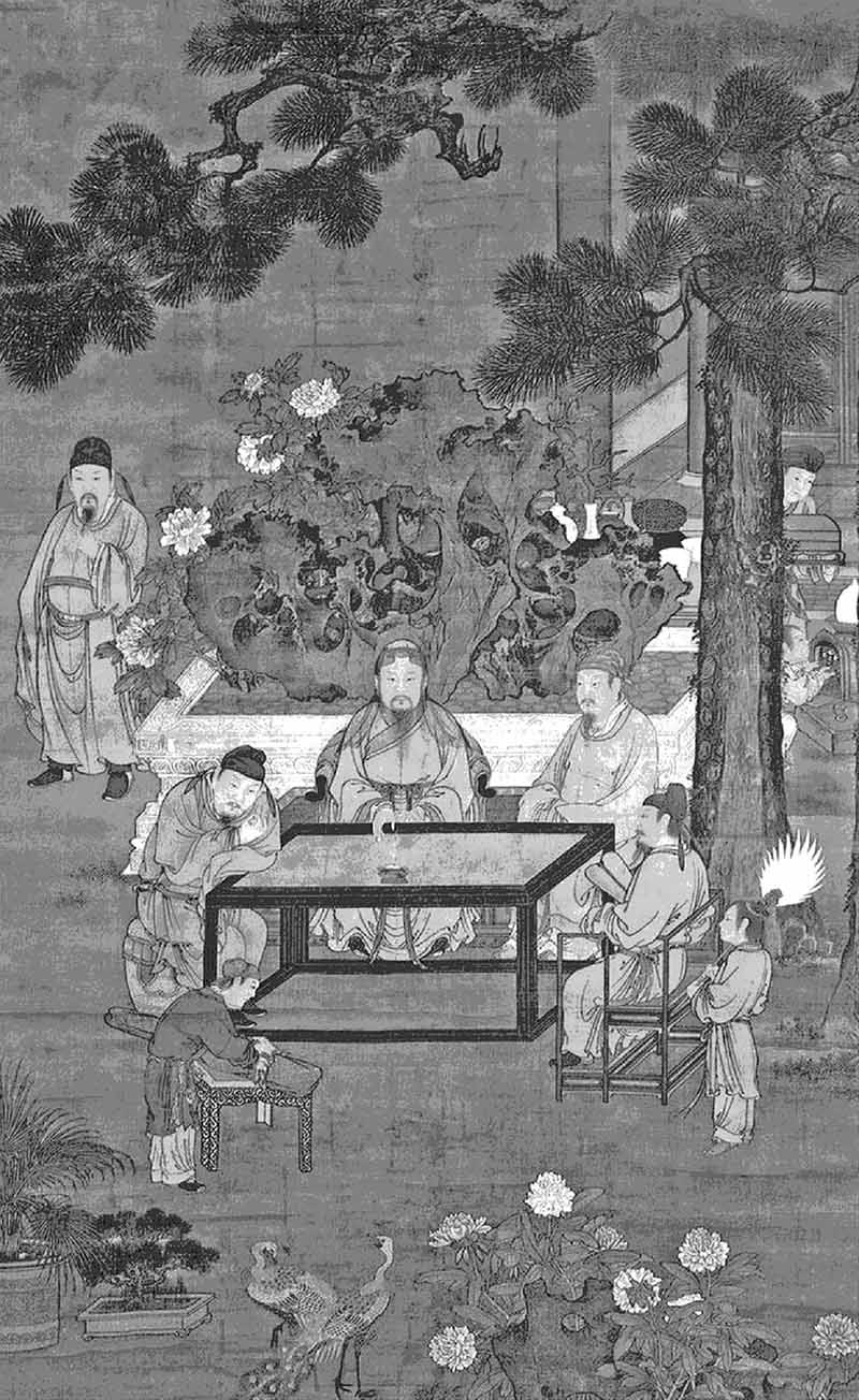 宋代盆景在形式和内容上均达到了较高的艺术水准,对盆景的布局、画意的安顿、诗情的灌注以及对石材、植物的研究逐步深入,而意境的创造则更具匠心。北宋大文豪苏轼在《格物粗谈》中提到:“芭蕉初发分种,以油簪横穿其根二眼,则不长大,可作盆景。”这是盆景作为专门名称最早的文字记载。宋代绘画《十八学士图》(图1-4)四轴之二幅中均画有松树盆景。