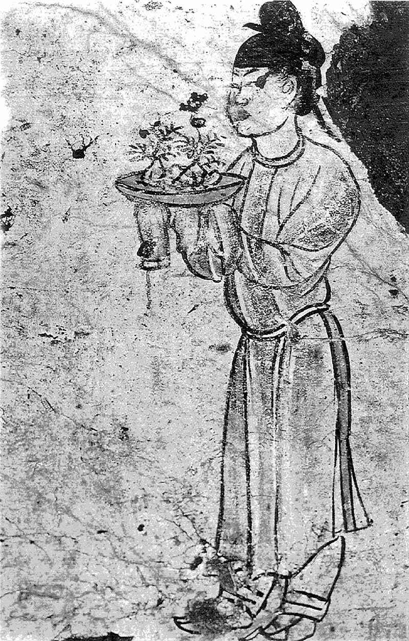 东汉时期,人们就已经将自然美景移入盆中,放在室内作观赏之用,开始出现了以植物、盆钵、几架三位一体的盆栽整体艺术形象,如图1-3所示是东汉墓壁画上的盆景。考古发现,在河北省望都的东汉墓道壁画上,绘有一陶质卷沿圆盆,盆内栽有六枝红花,盆下有一方形架座。考古发现的汉代陶砚以及汉晋时期流行的“博山炉”中出现了模拟仙山神水的景观,可看作中国山水盆景的起源。