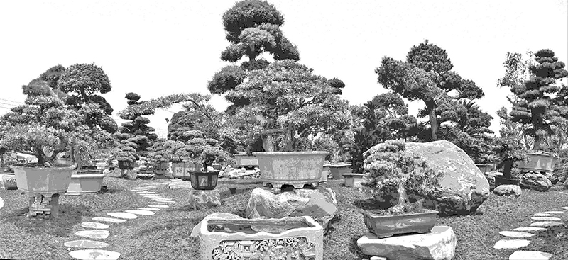 盆景是通过对树木、山石等材料进行精心的培养与修饰,在盆中典型地反映自然景观的艺术品。典型地反映自然景观是指盆景中的树木、山石的造型及相互之间组合的造型,是人们通过艺术形象对自然的认识和理解,能典型、集中地反映自然的本质,融合了美学、文学和科学,是自然景观的再现。如图1-1所示是松树盆景园。