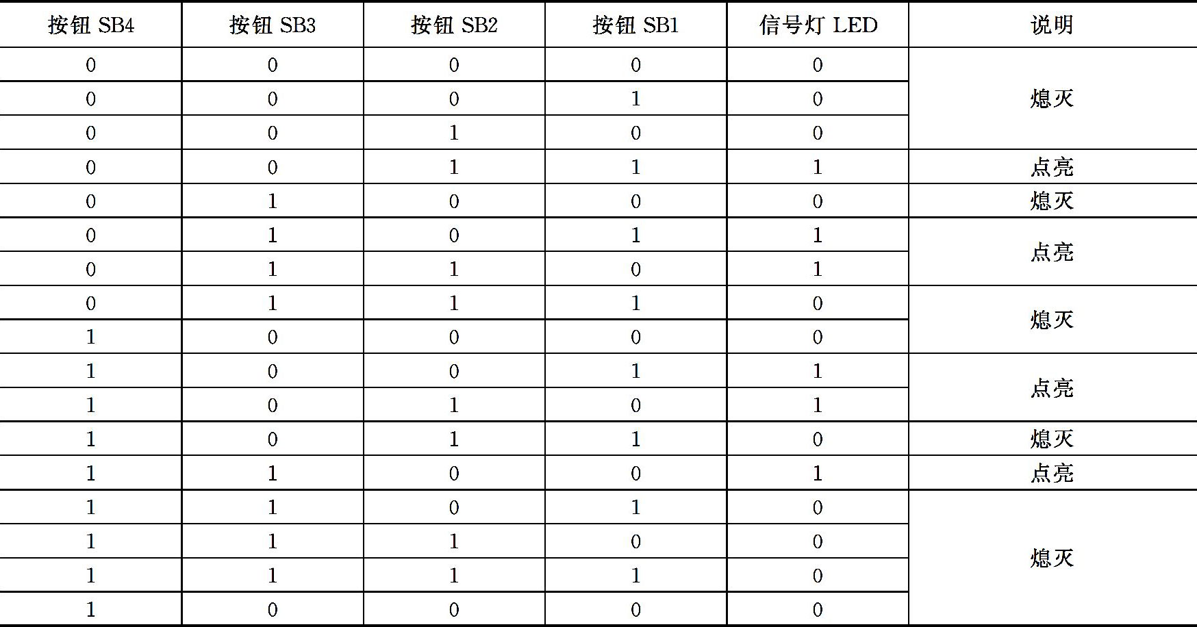 4个按钮,可以组合成2 4 =16组状态。因此,根据要求,可以列出真值表如表4-58所示。