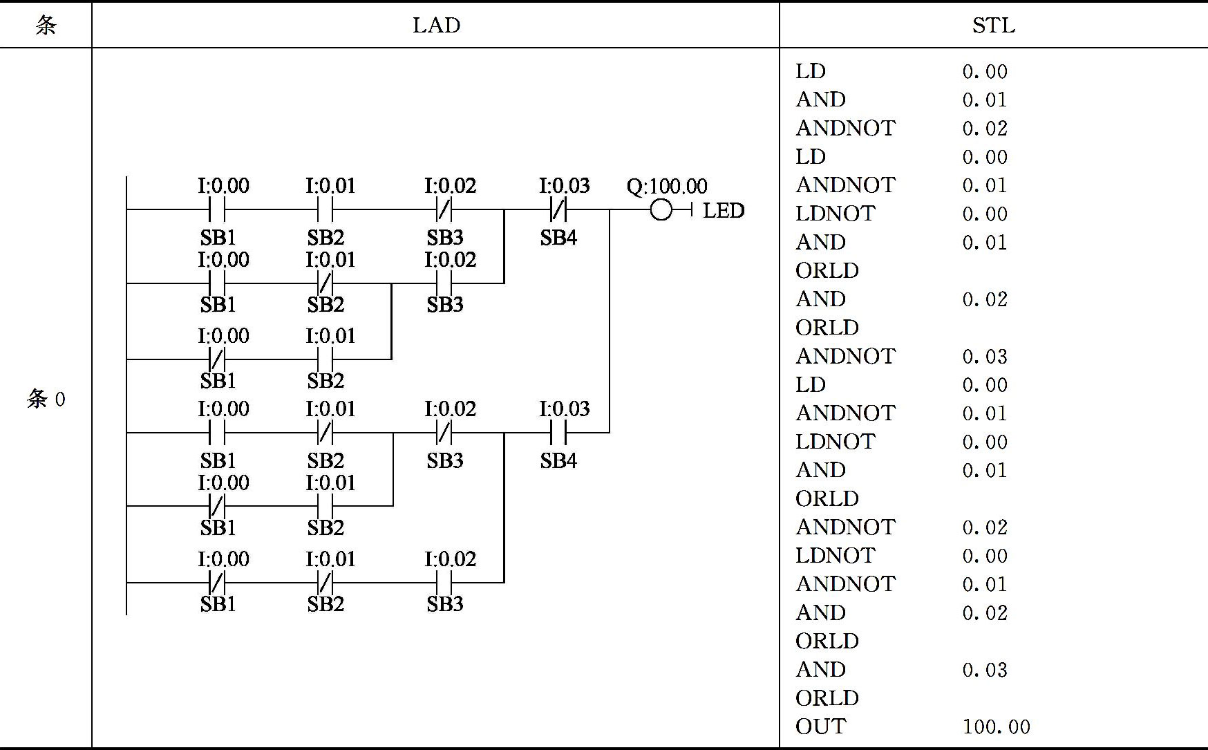 根据用4个按钮控制1个信号灯的控制分析和PLC资源配置,设计出用4个按钮控制1个信号灯的PLC梯形图(LAD)及指令语句表(STL),如表4-60所示。