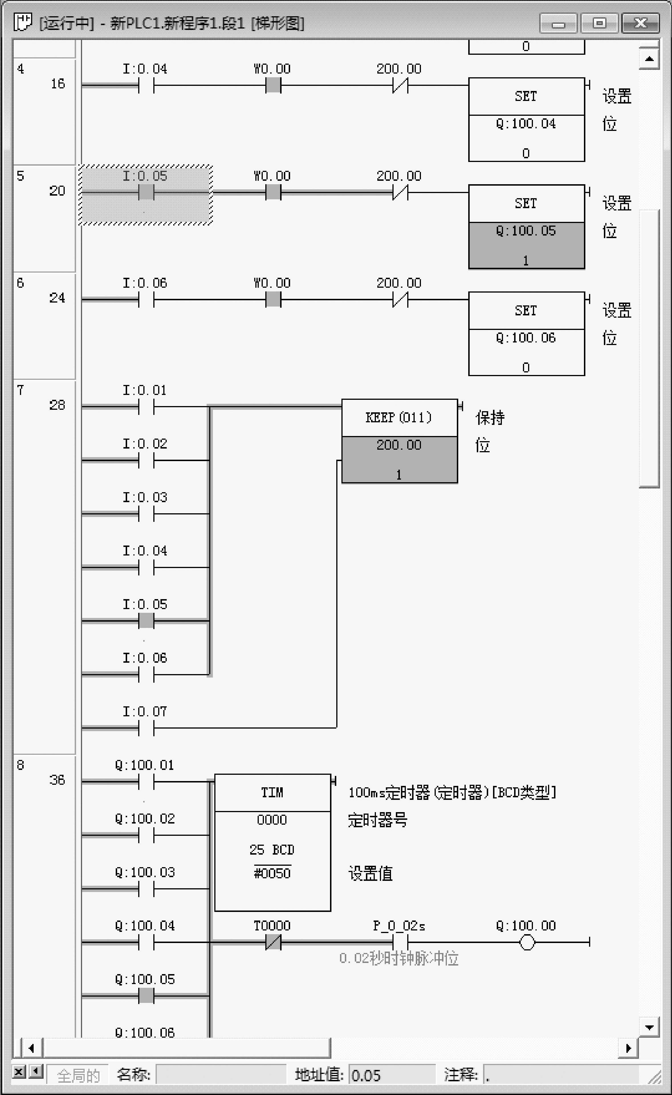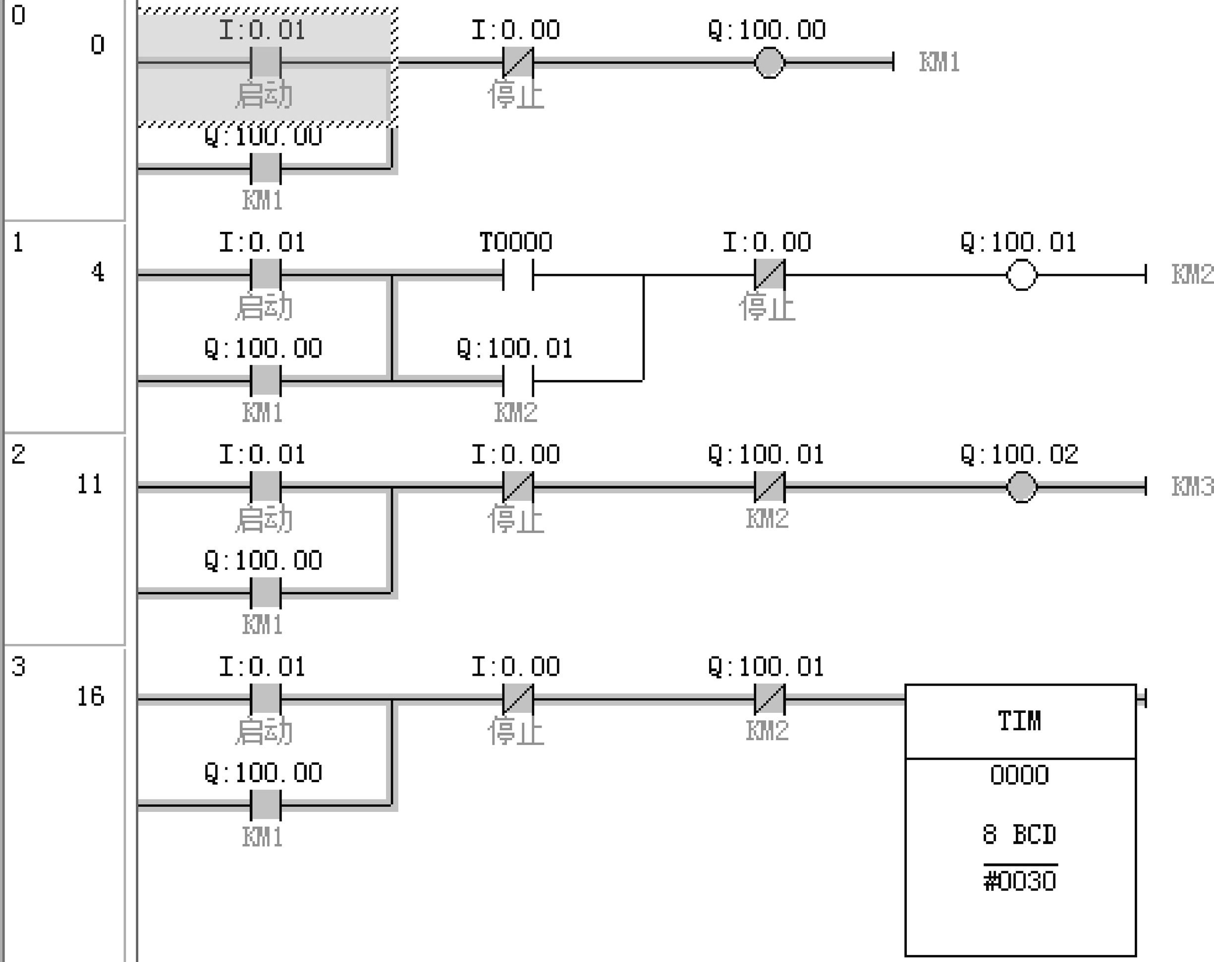 ③刚进入在线仿真状态时,线圈100.00、100.01和100.02均未得电。按下启动按钮SB2,0.01触点闭合,100.0线圈输出,控制KM1线圈得电,100.0的常开触点闭合,形成自锁,启动T0000延时,同时KM3线圈得电,表示电动机星形启动,其仿真效果如图4-8所示。当T0000延时达到设定值3s时,KM2线圈得电,KM3线圈失电,表示电动机启动结束,进行三角形全压运行阶段。只要按下停车按钮SB1,0.00常闭触点打开,都将切断电动机的电源,从而实现停车。