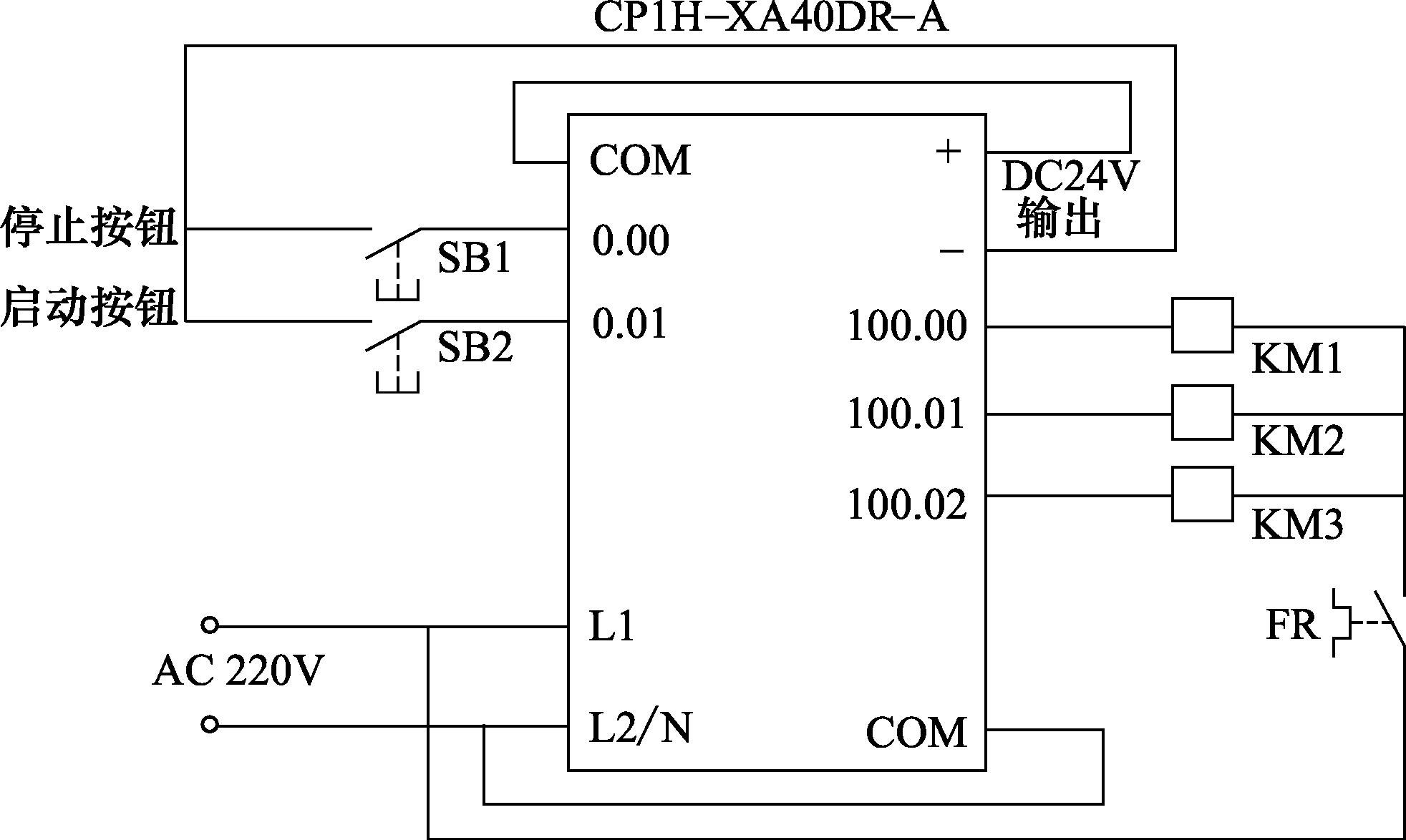 为了节约I/O端子,可以将FR热继电器触头接入到输出电路,以节约1个输入端子。KT可使用PLC的定时器T0000替代。