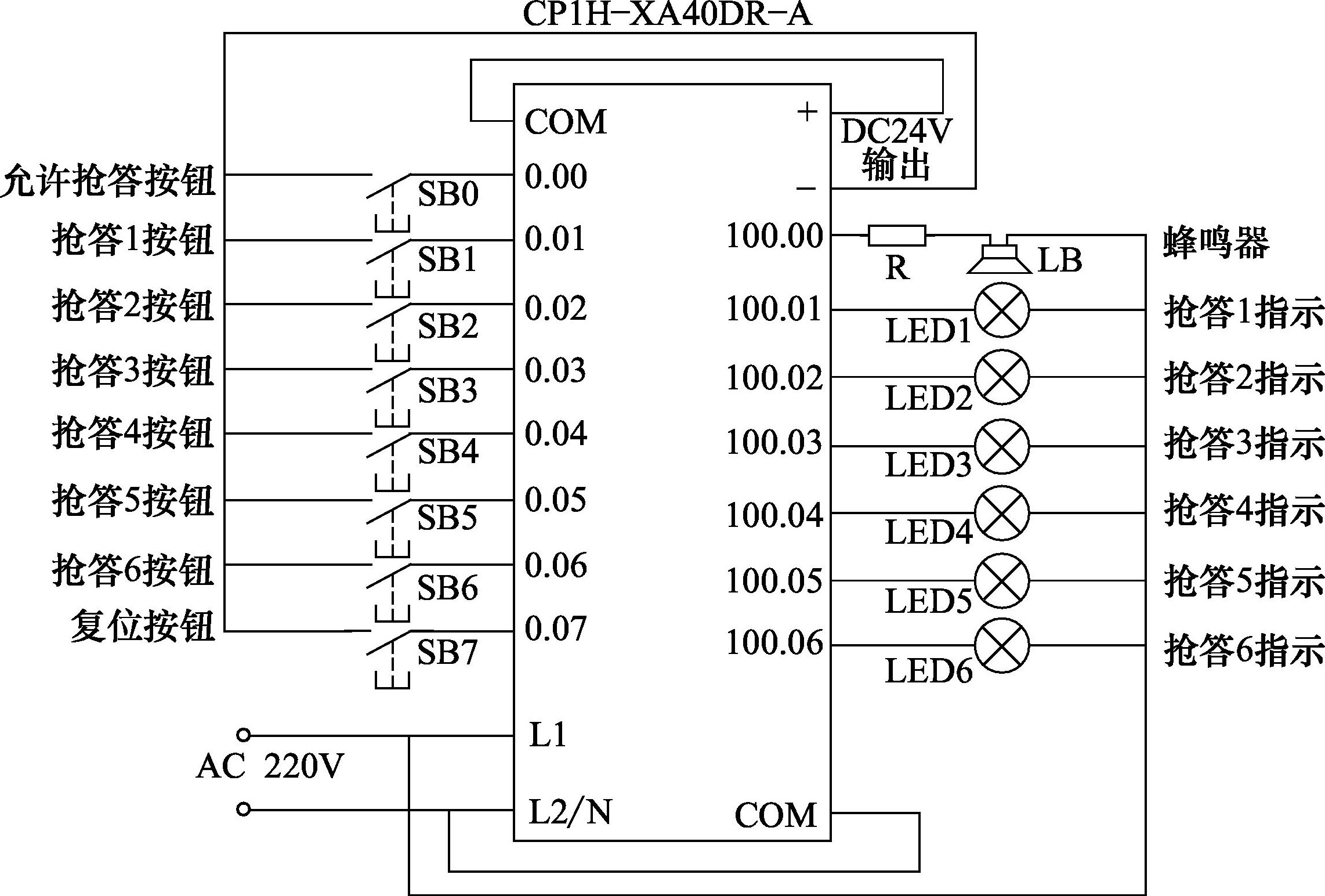 每组有1个常开按钮,分别为SB1、SB2、SB3、SB4、SB5、SB6,且各有一盏指示灯,分别为LED1、LED2、LED3、LED4、LED5、LED6,共用一个蜂鸣器LB。其中先按下者,对应的指示灯亮、铃响并持续5s后自动停止,同时锁住抢答器,此时,其他组的操作信号不起作用。当主持人按复位按钮SB7后,系统复位(灯熄灭)。