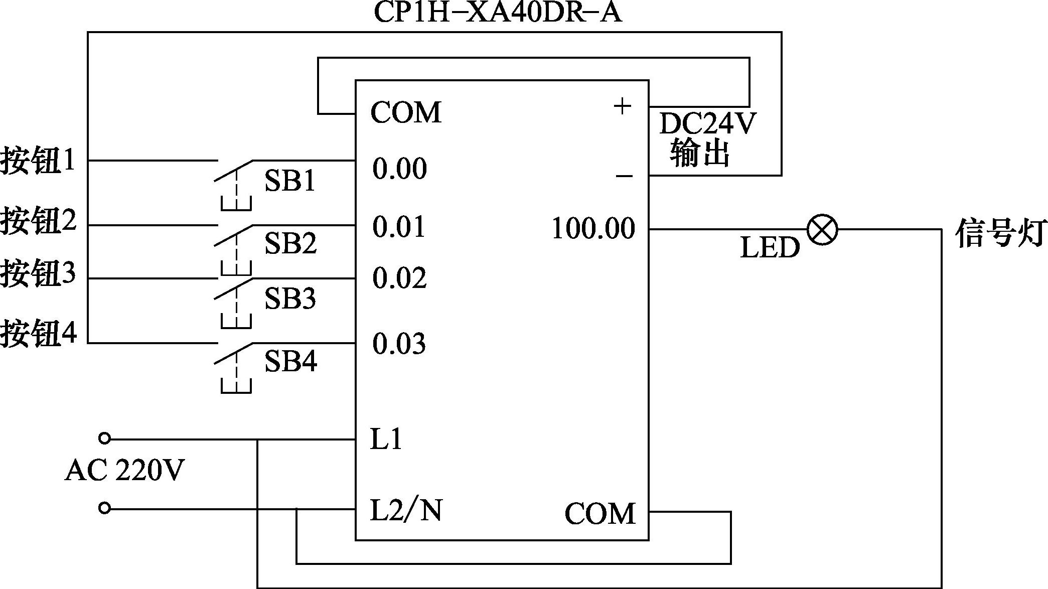 图4-9 用4个按钮控制1个信号灯的I/O接线