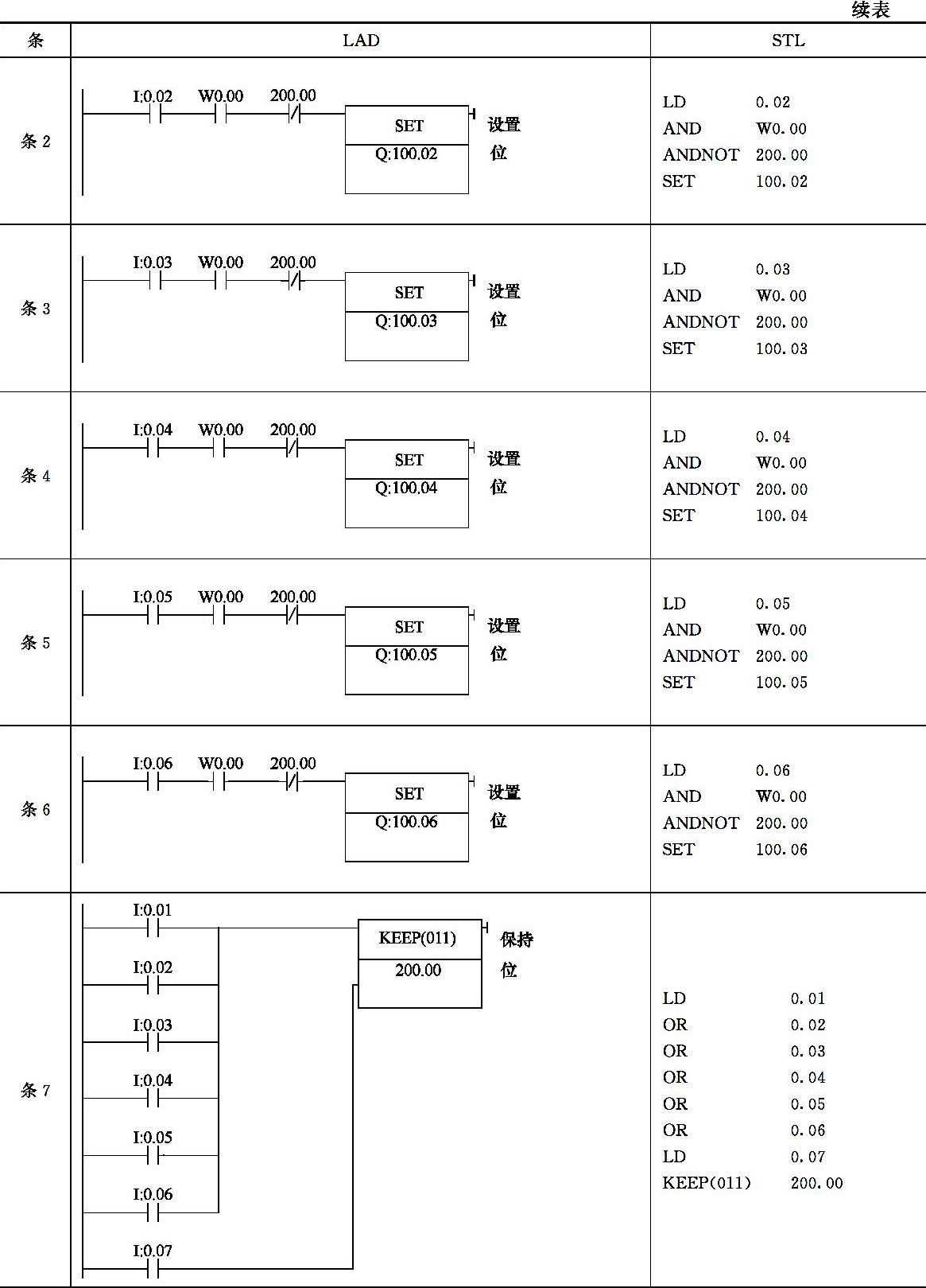 假设SB1、SB2、SB3、SB4、SB5、SB6、SB7分别与0.01、0.02、0.03、0.04、0.05、0.06、0.07相连;LED1、LED2、LED3、LED4、LED5、LED6分别与100.01、100.02、100.03、100.04、100.05、100.06相连。考虑到抢答许可,因此还需要添加一个抢答许可按钮SB0,该按钮与0.00相连。LB与100.00相连。要实现控制要求,在编程时,各小组抢答状态用6条SET指令保存,同时考虑到抢答器是否已经被最先按下的组所锁定,抢答器的锁定状态用200.00保存;抢先组状态锁存后,其他组的操作无效,可以用KEEP指令实现,同时铃响5s后自停,可用定时器实现。