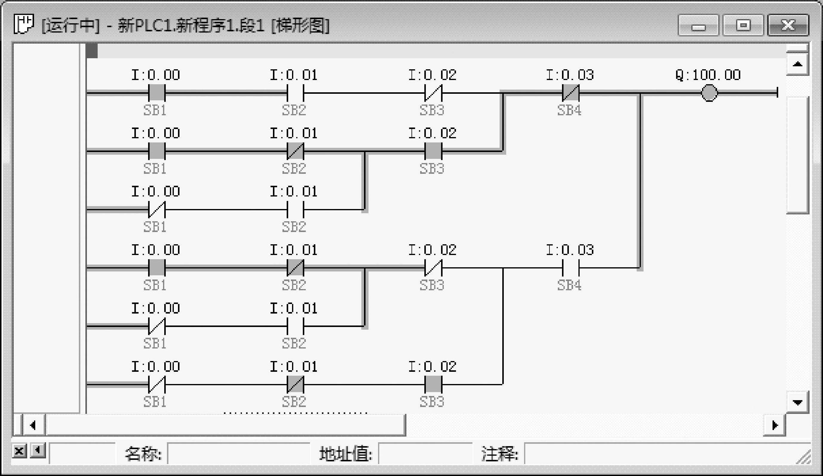 ③刚进入在线仿真状态时,100.00线圈处于失电状态。当某两个按钮状态为1时,100.00线圈得电,其仿真效果如图4-10所示。若一个或多于两个按钮的状态为1时,100.00线圈处于失电状态。