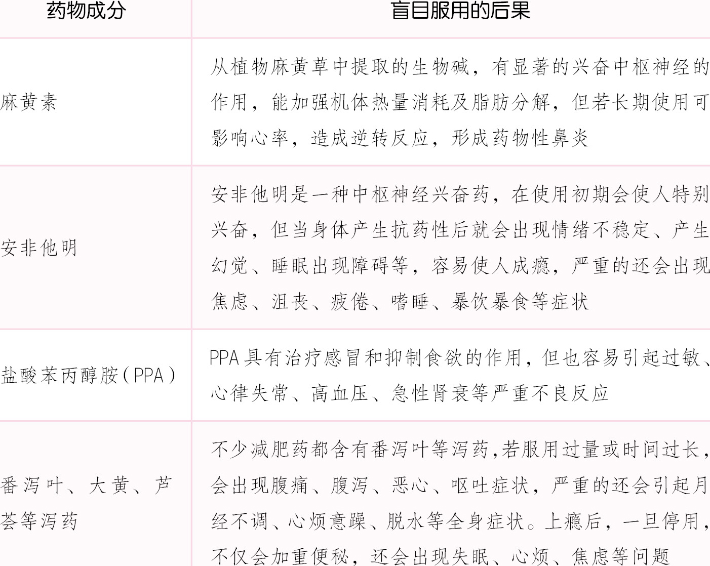 精明的商家瞄准女性市场,“发明”出诸多减肥药,并鼓吹吃了就能瘦。这让很多想快速瘦下来的女性怦然心动,毫不犹豫地掏出钱包。然而,很多女性朋友虽然花了不少钱,但不仅起不到减肥的效果,还出现心悸、口干舌燥、胃口变差、呕吐、腹泻、嗜睡等不适。这都是因为减肥药中的某些成分所致。