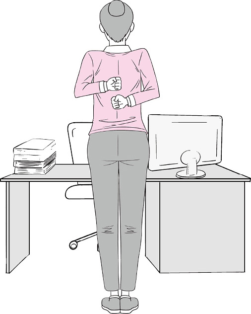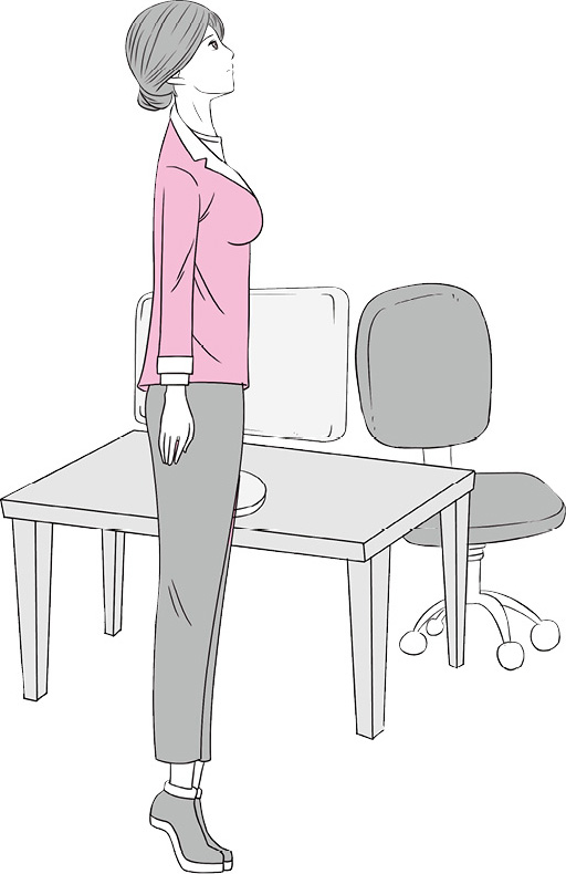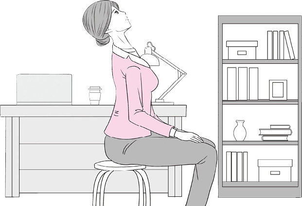当有一点儿空闲时间时,就闭上眼睛,身体放松,将头尽量后仰,保持5秒钟,然后低头使下颌尽量抵到胸前,保持5秒钟后抬起头,再缓慢做圆周运动。