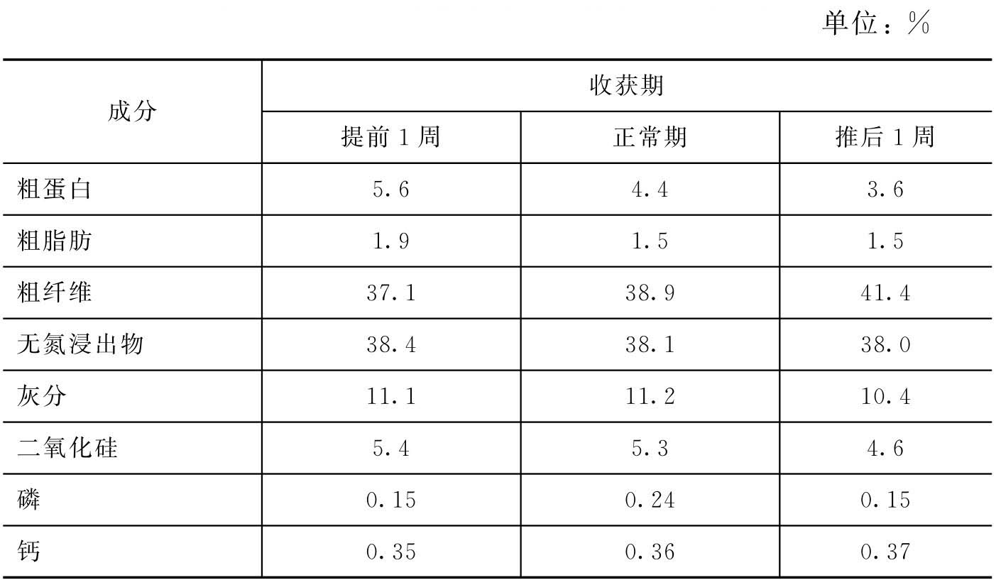 随着作物植株的老化,秸秆中可溶性碳水化合物含量下降,粗纤维和木质素含量增加,而秸秆的体外消化率与酸性洗涤纤维和木质素含量呈高度负相关(见表1-1~表1-3)。因此,需要掌握秸秆的营养成分变化规律,按时收获,取得品质更好的秸秆。