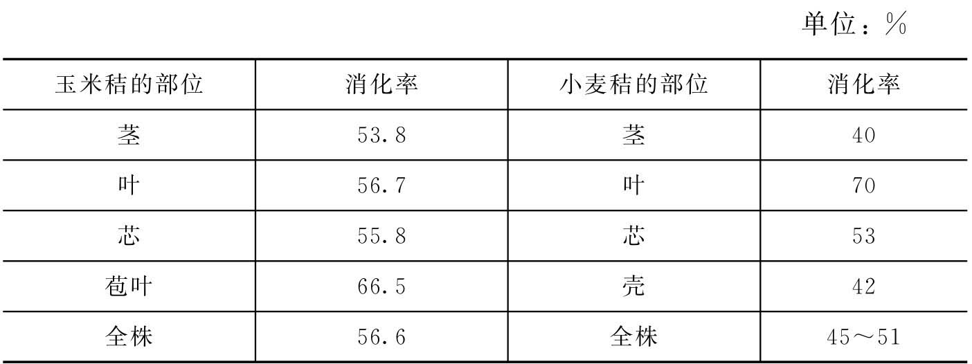 (4)秸秆部位 秸秆的不同部位,营养成分和消化率也都有较大的差别(见表1-4和表1-5)。茎秆、皮、壳的粗蛋白含量相对较低,而叶片较高,消化率也是如此。