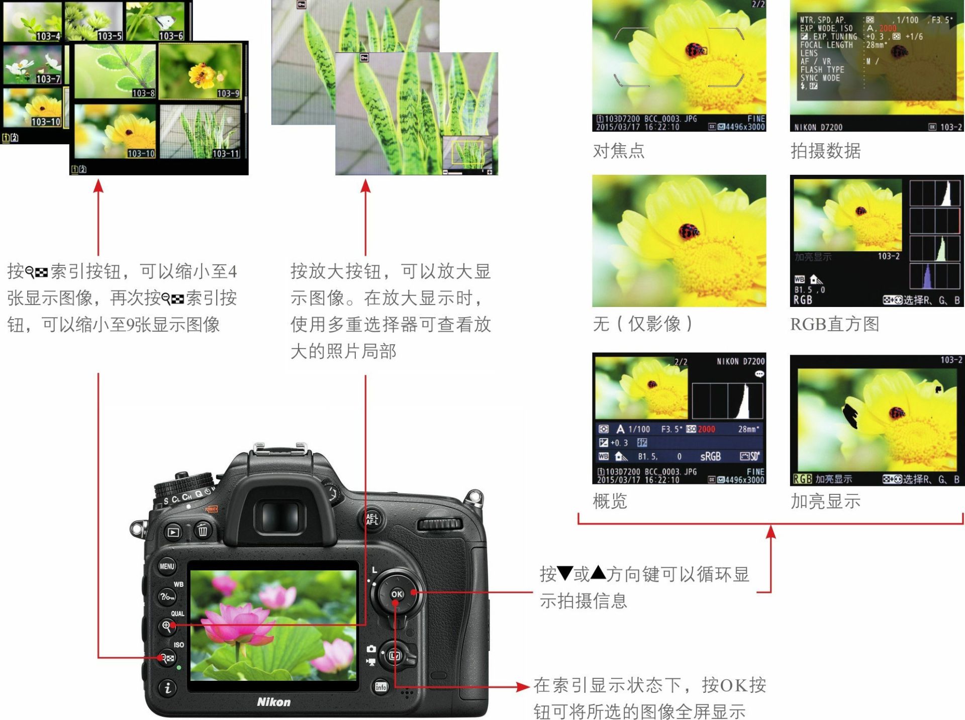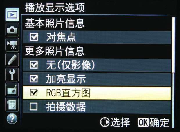 方向键会显示一些相关的参数,以方便我们了解照片的具体信息,例如,显示亮度直方图可以辅助判断照片的曝光是否准确。此外,还可以根据需要设置回放照片时是否显示对焦点、高光警告及RGB直方图等,这些信息对于判断照片是否在预定位置合焦、是否过曝至关重要。选中各个选项后,照片在预览时的显示效果,如P30页所示。