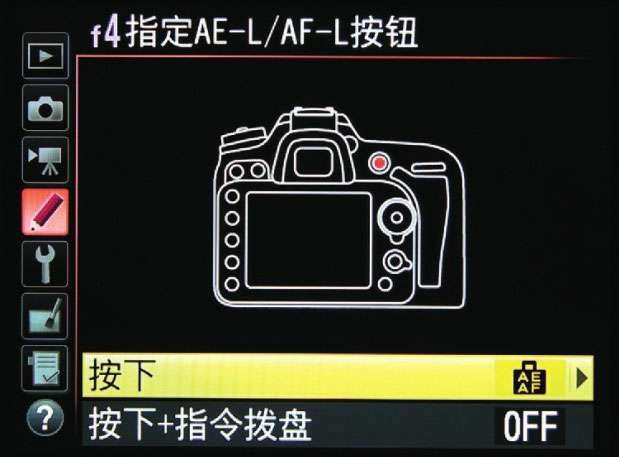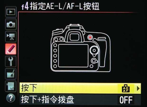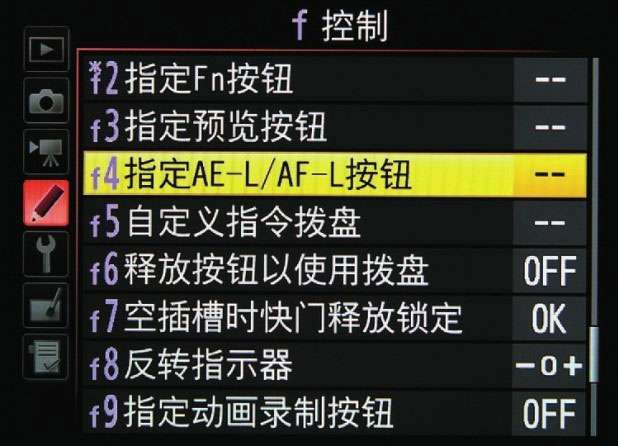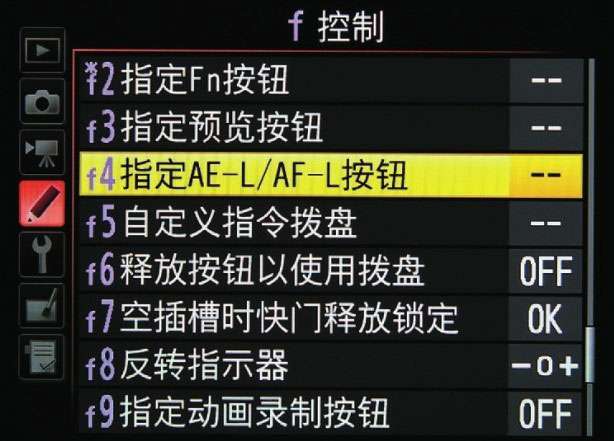 1 进入 自定义设定 菜单,选择 f控制 中的 f4指定AE-L/AF-L按钮 选项