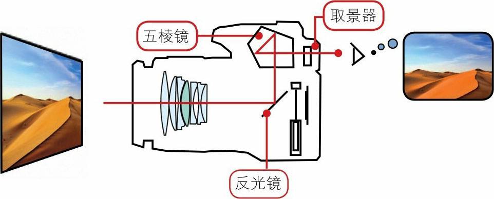 在了解光学取景器取景的优点和缺点之前,先了解一下光学取景器拍摄的工作原理。其原理是光线通过镜头射入机身内部的反光镜上,然后反光镜把光线反射到五棱镜上,拍摄者通过五棱镜上反射回来的光线就可以直接查看被摄对象。因此,采用这种方式拍摄时,人眼看到的景物和相机看到的景物基本上是一致的。