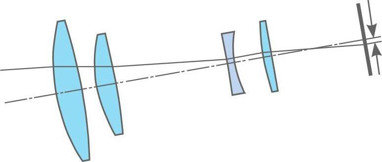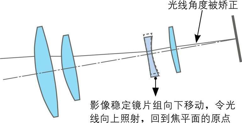 当镜头向下倾斜时,相机抖动使光线射向焦平