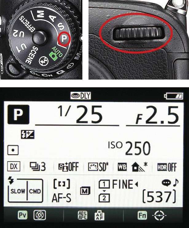 在操作时,如果向右旋转主拨盘,可以获得模糊背景细节的大光圈(低F值)或“锁定”动作的高速快门曝光组合;如果向左旋转主拨盘,可获得增加景深的小光圈(高F值)或模糊动作的低速快门曝光组合。