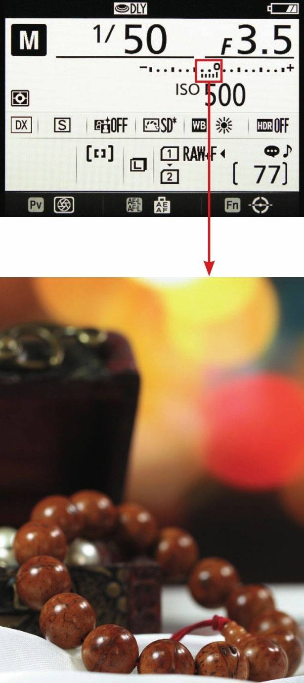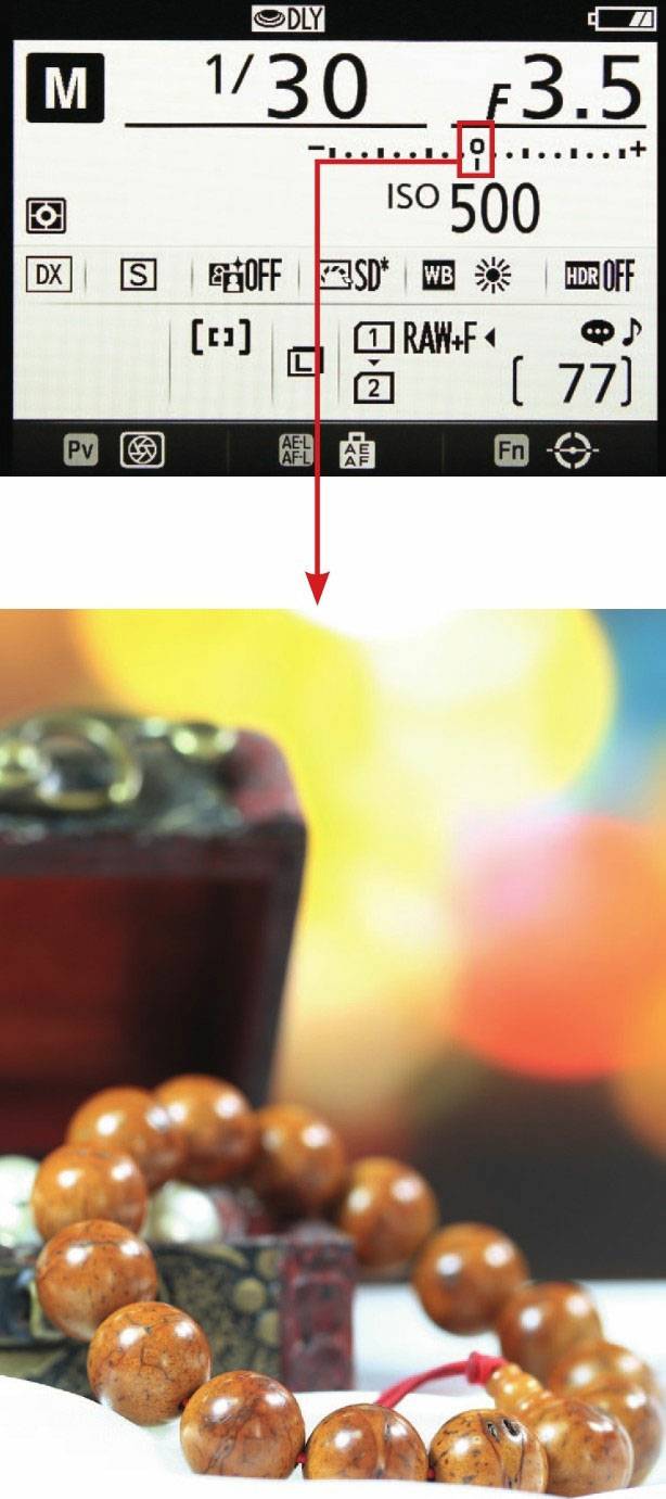 (4)此时看看相机上的曝光量标志是否在标准曝光量标志位置,如果不在中间,可以微调光圈、快门速度和ISO来让曝光量标示移到中间。当然也不是所有的画面都需要标准曝光,在日常拍摄中,可以根据画面的明暗比例,使曝光量标志左右偏移,使画面呈现减少曝光补偿或增加曝光补偿的效果。