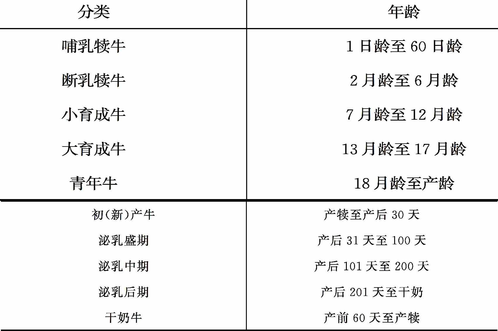 奶牛的生长过程包括哺乳犊牛、断乳犊牛、小育成牛、大育成牛、青年牛、初(新)产牛及干奶牛等七个阶段,各阶段年龄如表1-6所示。