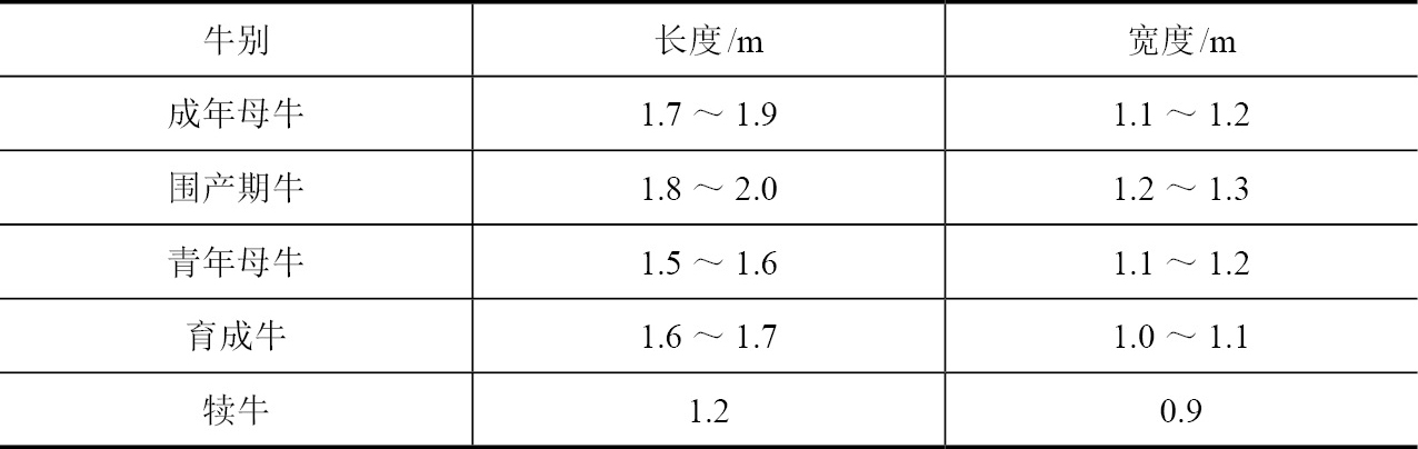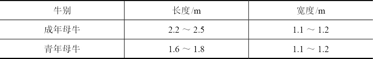 ② 青年牛、育成牛舍 多采用单坡单列敞开式。根据牛群品种、个体大小及需要来确定牛床、颈枷、通道、粪尿沟、饲槽等的尺寸和规格。