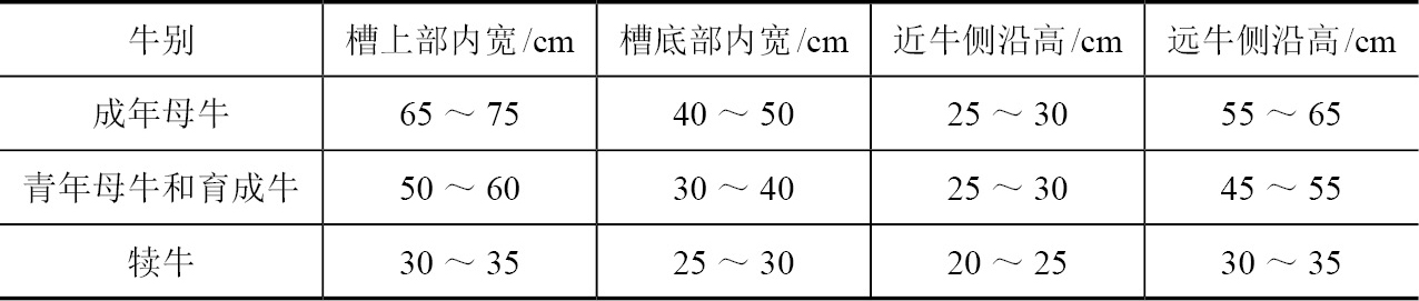 食槽表面要光滑、不渗水,要耐酸碱、耐磨。两侧的槽壁要呈圆弧形,食槽底部要平。食槽排水口一侧要低于对侧,以便于对食槽冲刷、消毒等。奶牛饲槽尺寸参数见表1-3。