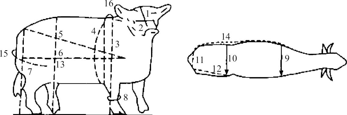 常用测量器具有测杖、卷尺、圆形测量器、测角计等,体尺测量数目依测量目的不同各异。常用体尺有(图2-1):