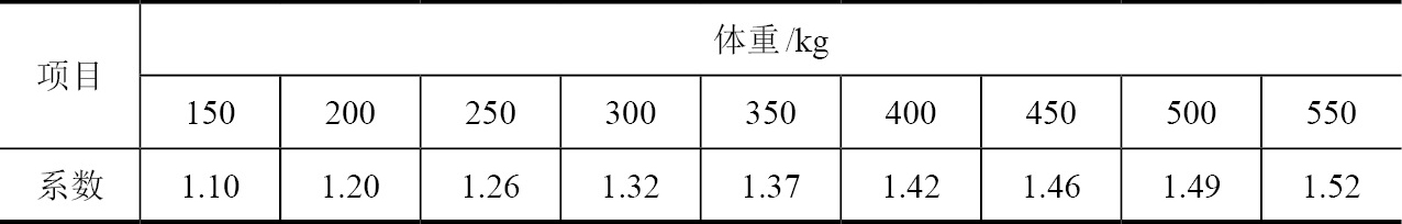 (3)种公牛的能量需要 种公牛的能量需要(MJ)=0.398× W 0.75 。式中, W 为体重(kg)。
