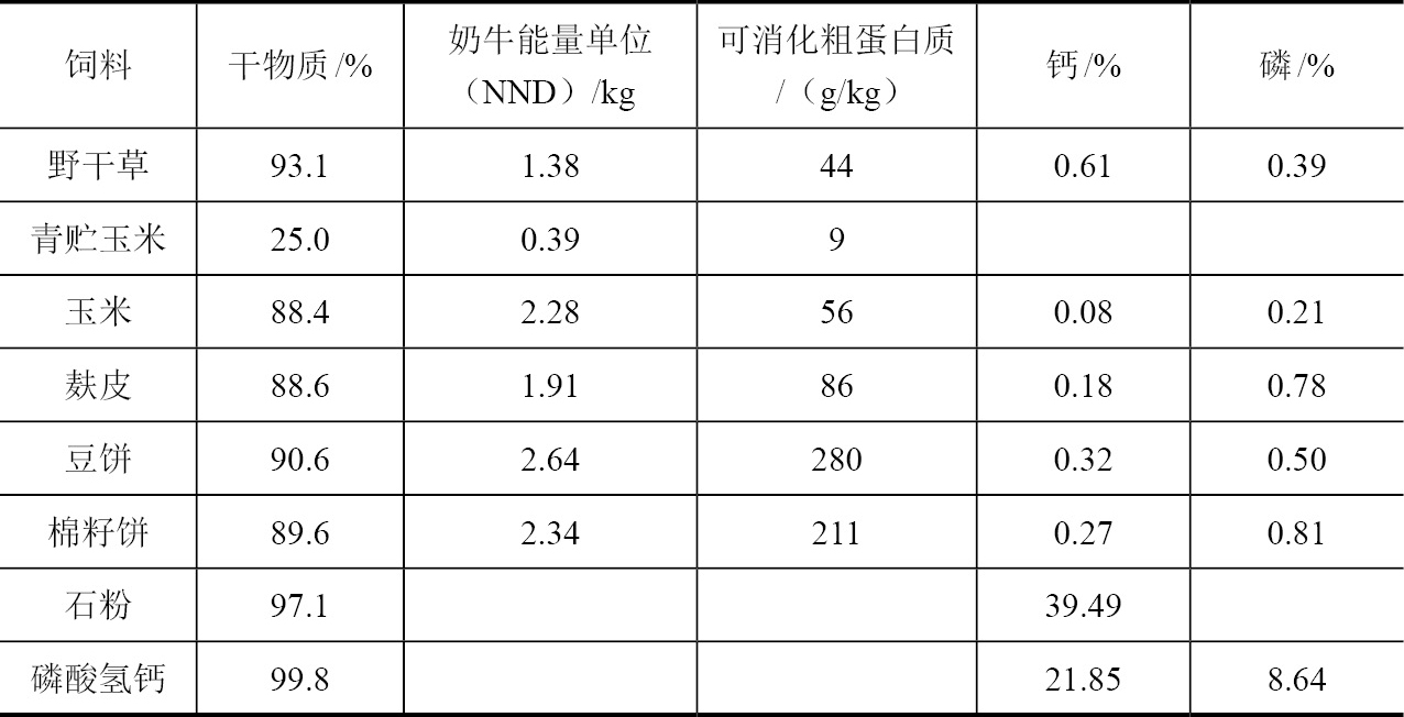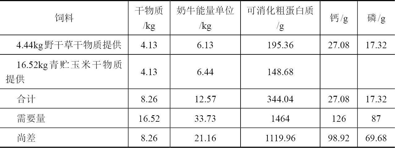这样即可算出由野干草、青贮玉米所提供的养分量和尚差的养分量(表2-13)。