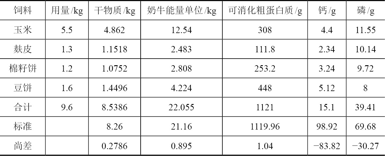 (4)计算结果,日粮中尚缺干物质8.26kg、奶牛能量单位21.26kg、可消化粗蛋白质1119.96g、钙98.92g、磷69.68g。不足营养用精料补充。每1kg精料按含2.4NND计算,补充精料量应为:8.26÷2.4=3.44kg。按照3.5kg精料初步拟定配方。