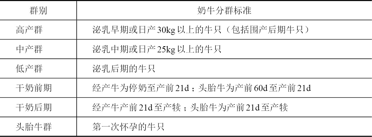 在实施TMR饲养工艺前必须将牛群进行分群管理,合理的分群对提高奶牛的健康度和产奶量以及合理控制饲喂成本等有非常重要的作用。在规模奶牛场中,后备牛需要根据不同生长发育阶段进行分群,成年母牛需要按照泌乳阶段的营养需要来进行分群,分群的同时要结合TMR工艺的操作可行性,避免出现牧场实际操作无法完成的问题。实际操作过程中,牛场一般按照表2-18的分群标准进行分群。