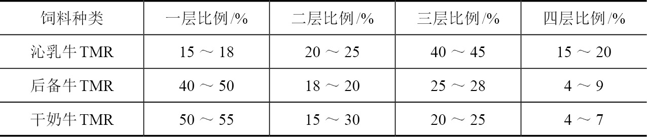 ③ 适当调整 当按照基本原则填料效果欠佳时,当精饲料已提前混合一次性加入时,当混合精料提前填入易沉积在底部难以搅拌时,当干草未经过粉碎或切短直接填加时,填料顺序可适当调整: 干草→精饲料→青贮→其他。