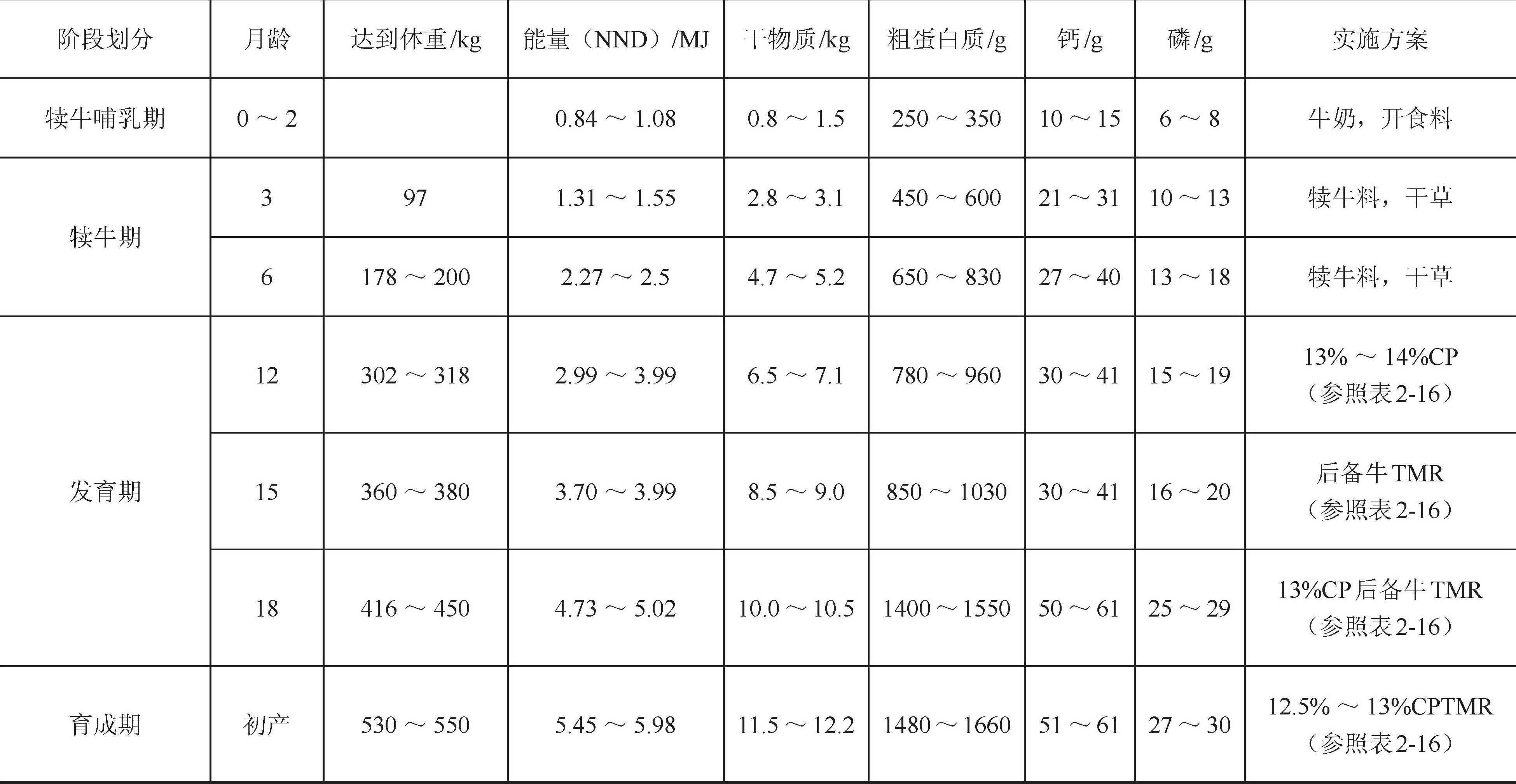 表2-15 成年母牛各阶段日粮营养需要实施表