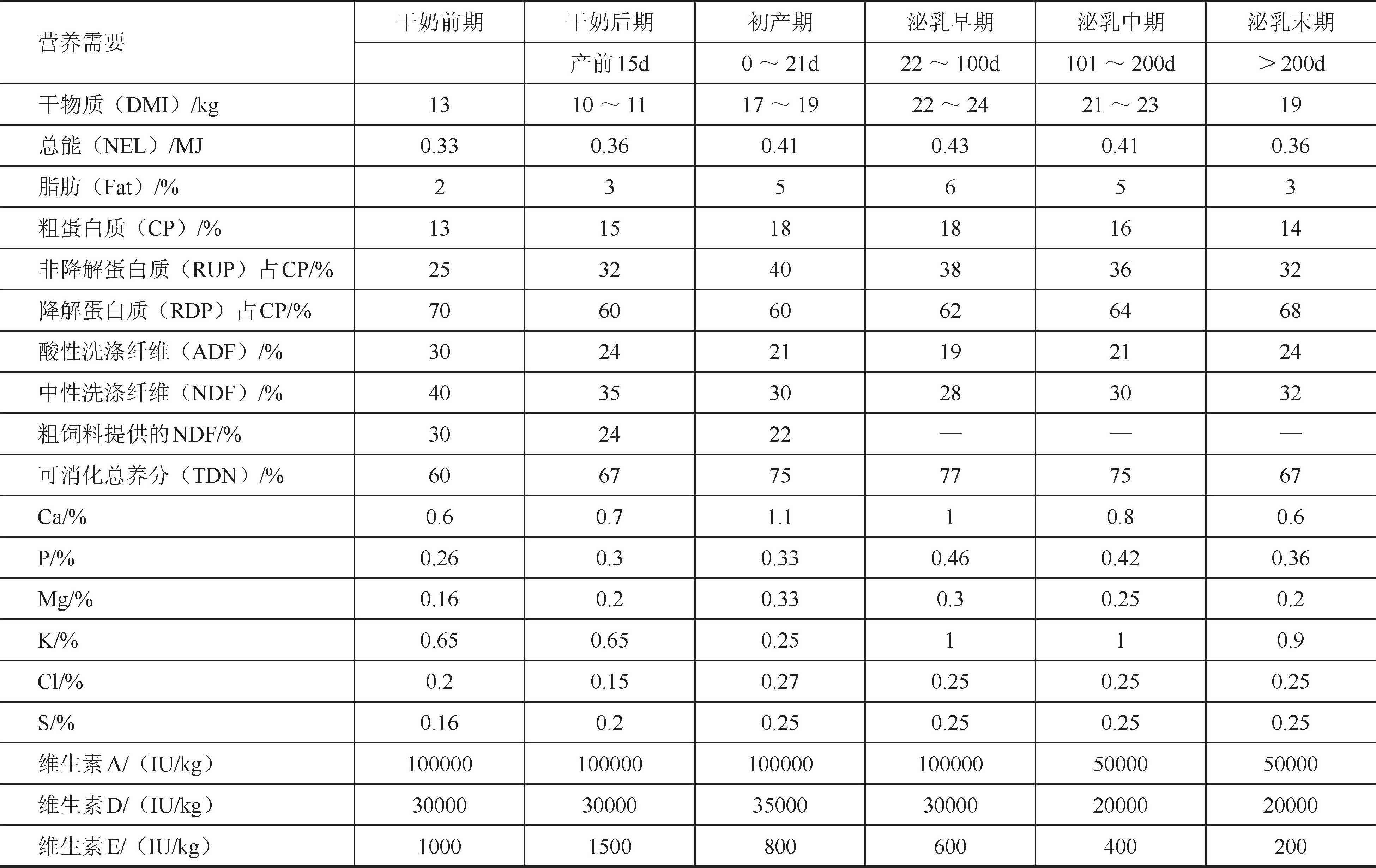 理想的日粮标准为中性洗涤纤维(NDF)含量在25%~33%之间,粗料NDF占整个NDF的50%~75%;粗蛋白质(CP)的含量在16.5%~17.5%,瘤胃非降解蛋白质(RUP)的含量在33%~38%,且长期相对稳定。具体可以参照成年母牛和后备牛各阶段日粮营养需要实施表(表2-15、表2-16)。