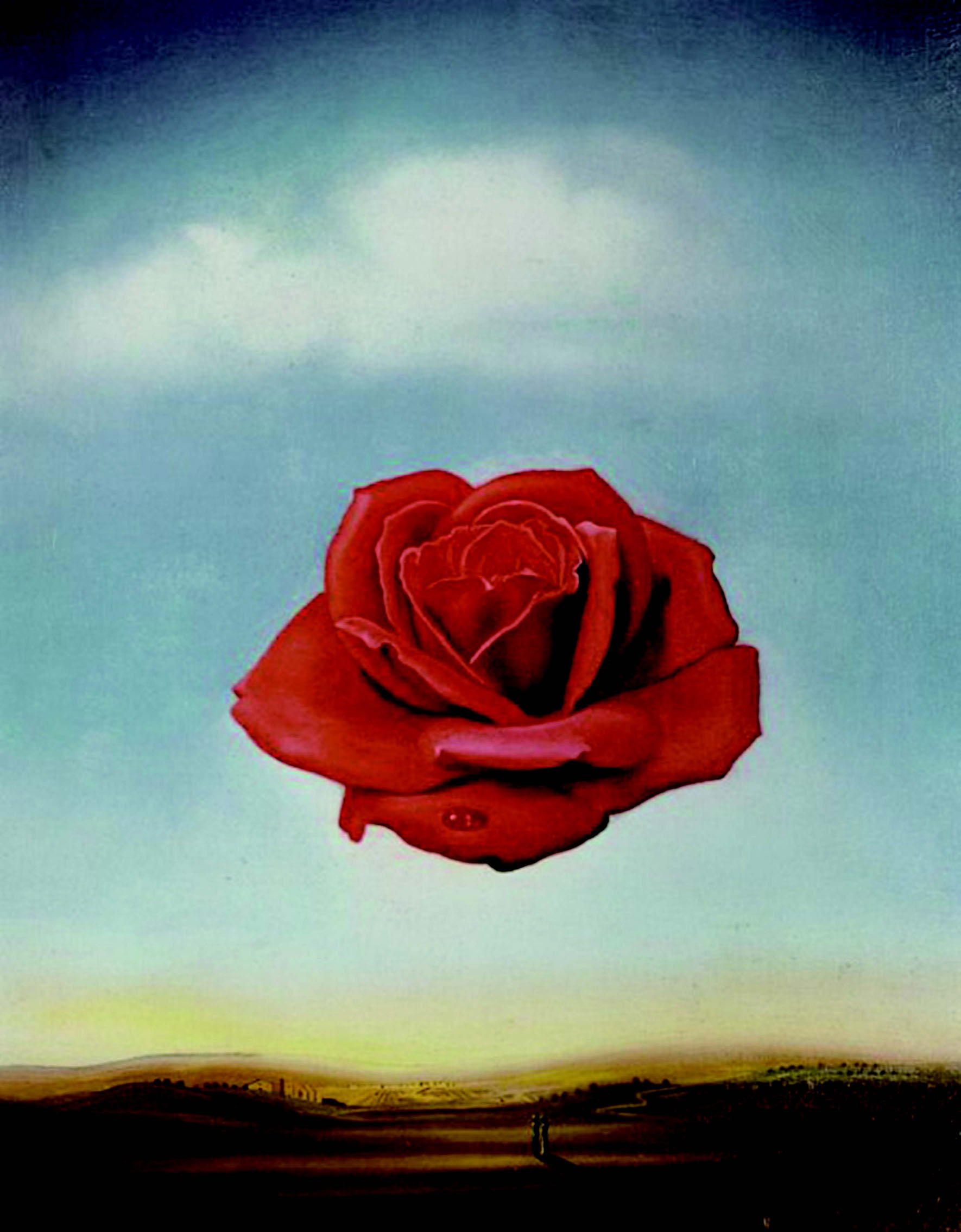 达利 1958 年创作的油画《冥想的玫瑰》是其超现实主义的代表作之一。一朵悬浮在空中的玫瑰,异常鲜艳,与蔚蓝色的天空形成色彩上的强烈对比。达利并没有给这朵玫瑰画上叶子或者是刺,它就那么安静地带着一颗水珠悬浮在天空中。花的下面,是一片广阔的荒漠中一小块若隐若现的绿洲小城。一对小人在眺望着小城,夕阳西下。作为观众的我们,只能看到他们小小的人影和被暮光拉长的背影。他们是一对情侣?又或者只是海市蜃楼里的岩石(见彩图16)?