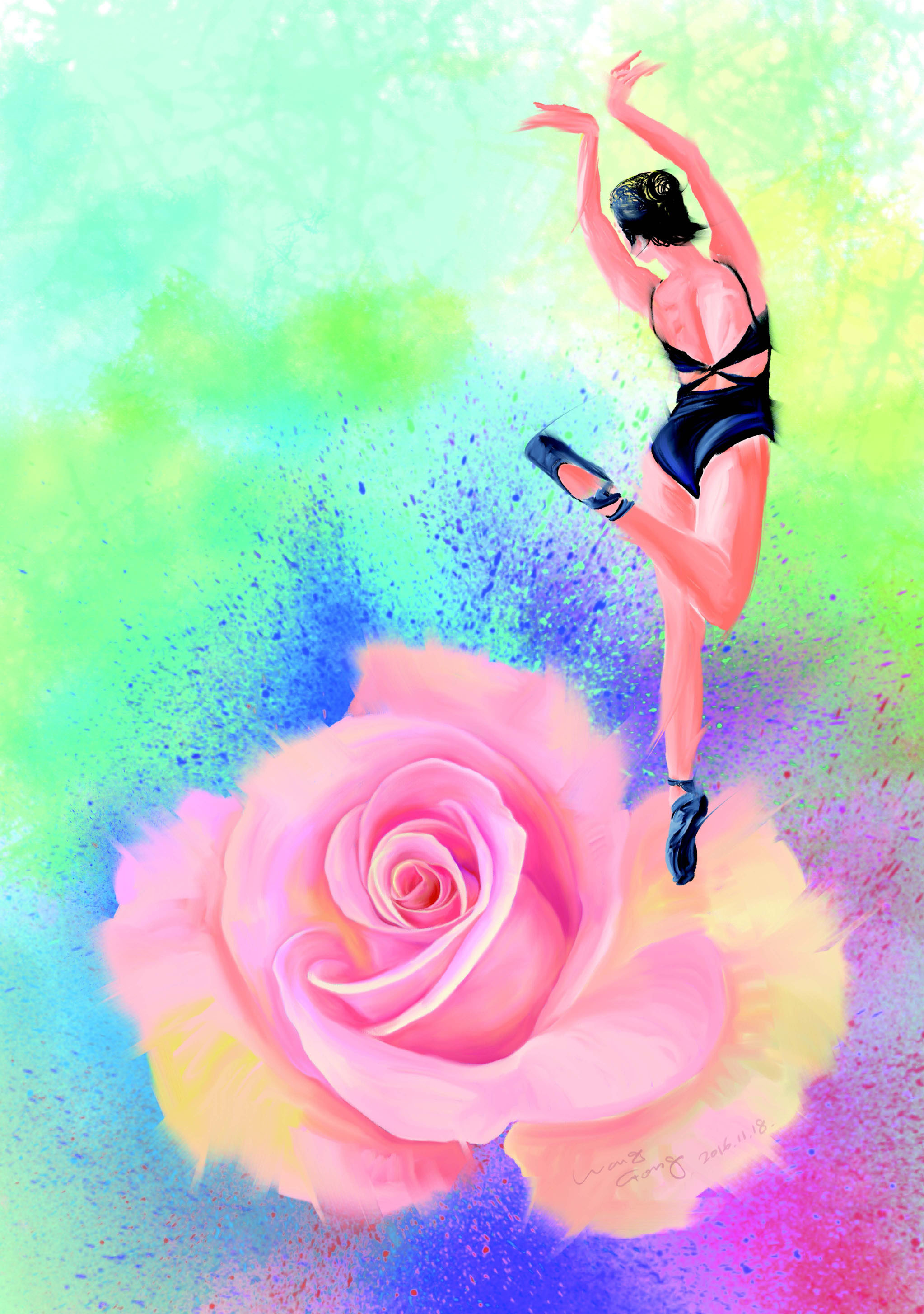 艳丽、妩媚、高雅的玫瑰与丰富多彩、蓬蓬勃勃、积极向上的生活灵感相互交融,迸发创作激情,创作出活生生的玫瑰作品。活生生的玫瑰作品又进一步激发出内心的灵感,进而促进更好地创作。由此,把玫瑰作为创作中永恒不变的主题之一(见彩图17、彩图18)。
