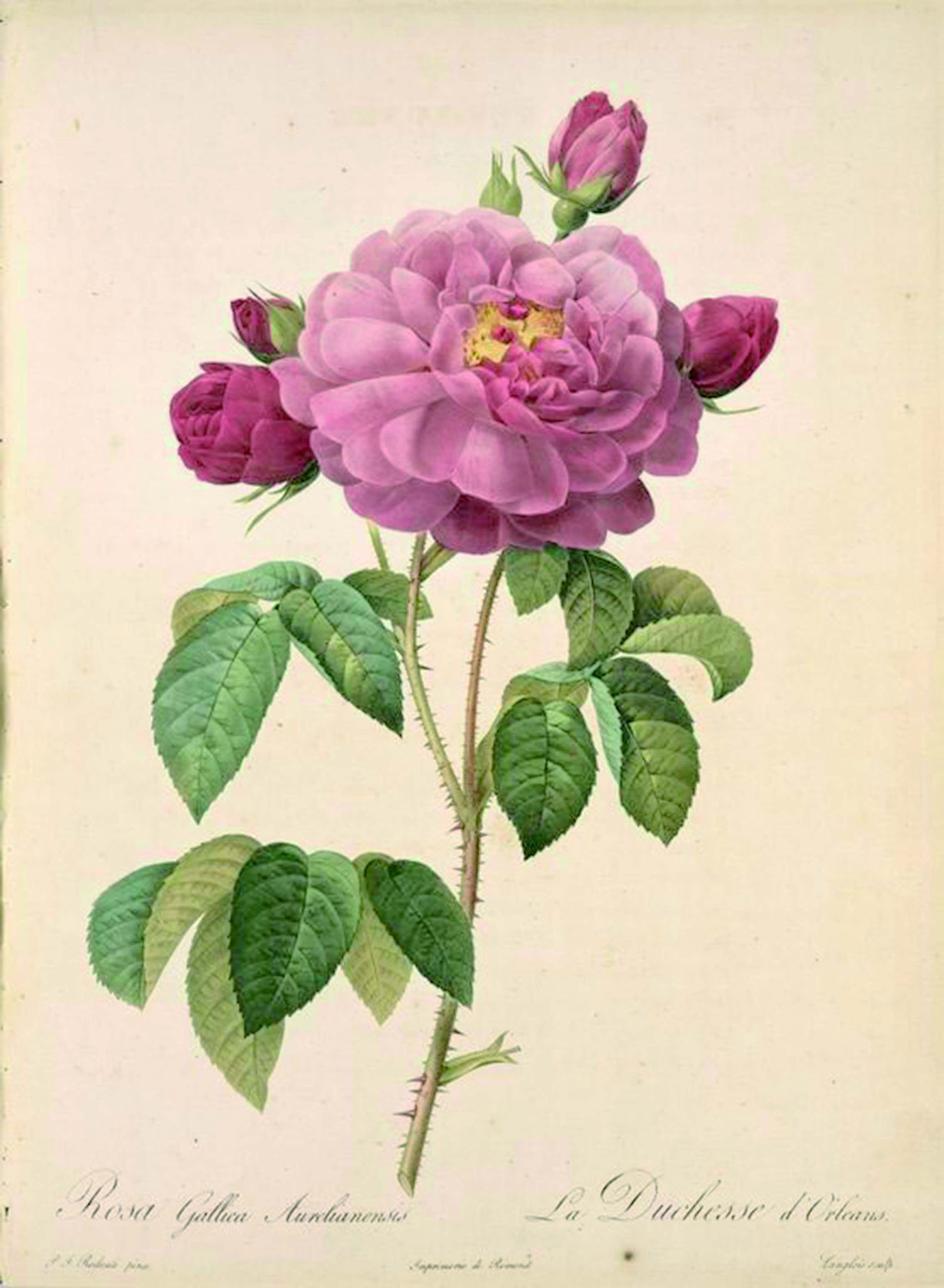 皮埃尔·约瑟夫·雷杜德(Pierre Joseph Redouté),1759 年 7 月 10 日生于比利时圣胡伯特,自幼成长在画家世家,这为他将来成为绘画大师奠定了基础。1782 年,23 岁的雷杜德来到了巴黎,怀着绘画的梦想,应聘到国家自然博物馆工作。由于他的绘画功底很好,工作表现出众,被当时国家自然博物馆著名花卉画家杰勒德·范·斯潘东克(1746—1822)收做弟子和助手。后来,出于对植物学的热爱,又师从著名植物学家查尔斯·路易斯·埃希蒂尔·德布鲁戴尔(1746—1800)。经过系统的学习和努力,他全面掌握了植物在形态方面的重要特点,这就使得雷杜德的绘画作品具有严格的学术性和写实性。