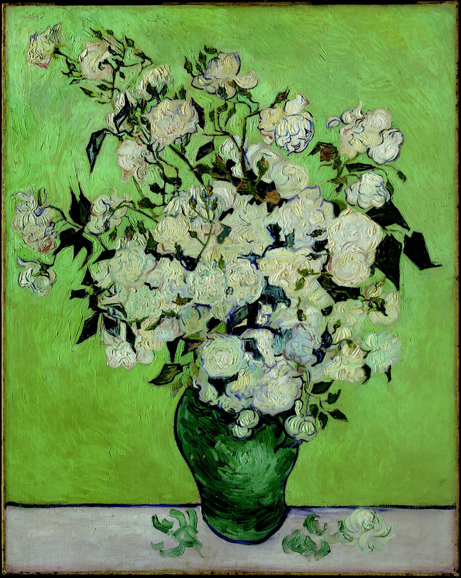 也许他已经隐隐意识到离他的人生终点已经不远。因此,他把自己对生命的热爱、对自然的热爱都倾注到自己的作品中。在这幅作品中,他没有选择灿烂的向日葵,没有选择迷人的鸢尾花,也没有选择鲜艳的红玫瑰。他选择了朴素绽放着的白玫瑰。这白色的玫瑰虽然朴实无华,但是仍然顽强地盛开,如同梵高自己的一生。他是那么急切地要表达自己对人生的热爱,迫不及待地把厚厚的油彩涂抹堆砌到画布上,以至于当他离开圣雷米疗养院时那油彩还没干。他只好把这幅作品暂时留在圣雷米疗养院。