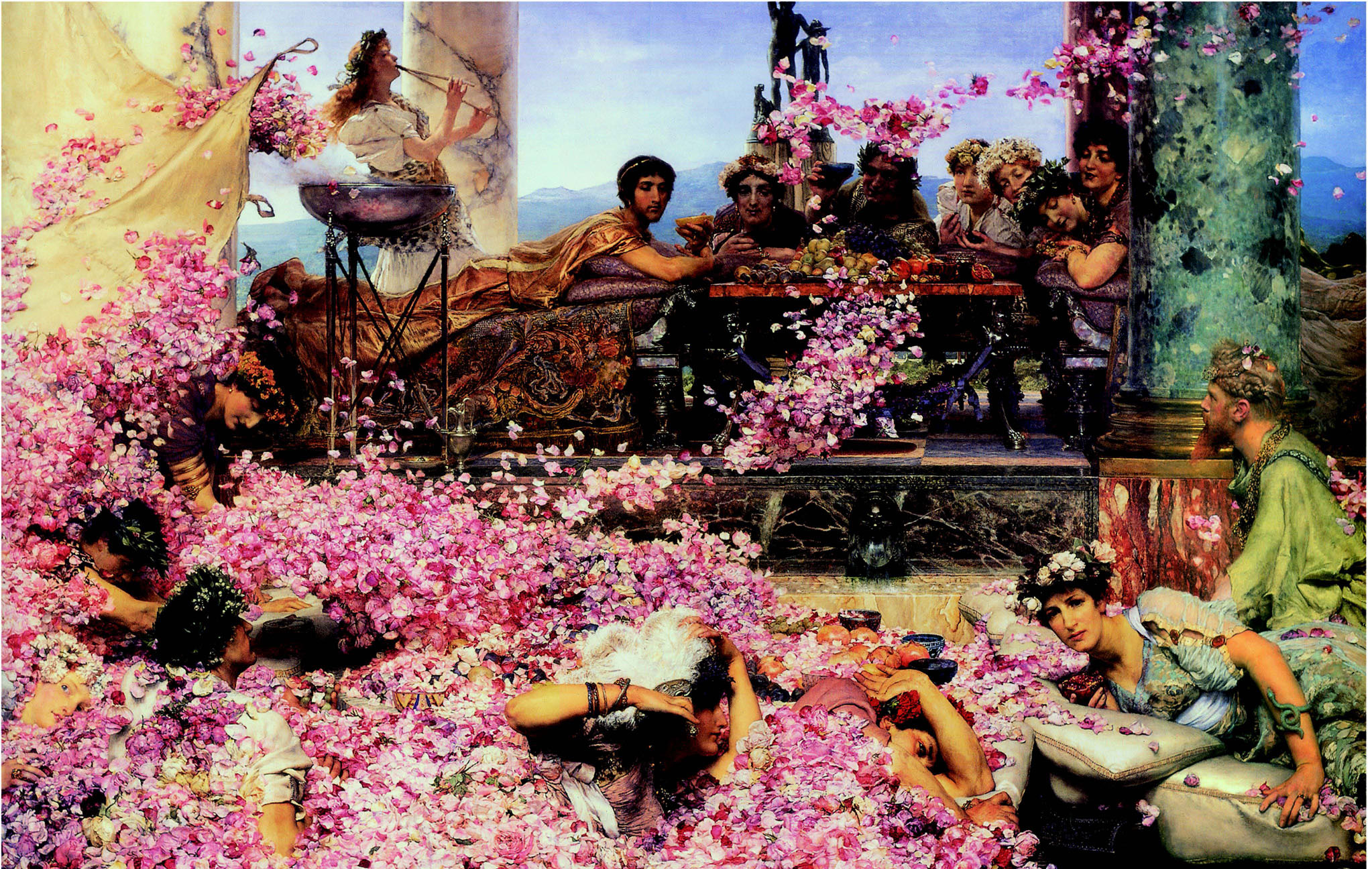 19 世纪的花语中,玫瑰一般代表美和感性的爱,后来在文艺中还染上了“颓废”的意味。当时的文学艺术多把基督徒划为“好”的范畴,而将罗马皇帝与之相对划入“坏”的范畴。塔德玛坚决避免这种道德化,而只邀请观众欣赏场景本身的诗意。画面被画家描绘得十分绚丽:花瓣、大理石、绸缎、薄纱、青铜器、花朵等。清明亮丽的环境中,走动着绝色佳丽。而与这一切形成鲜明反差的是残暴严酷的现实,但是,作者没有直接描述现实的丑恶,而是通过布景与色彩把它表现了出来。