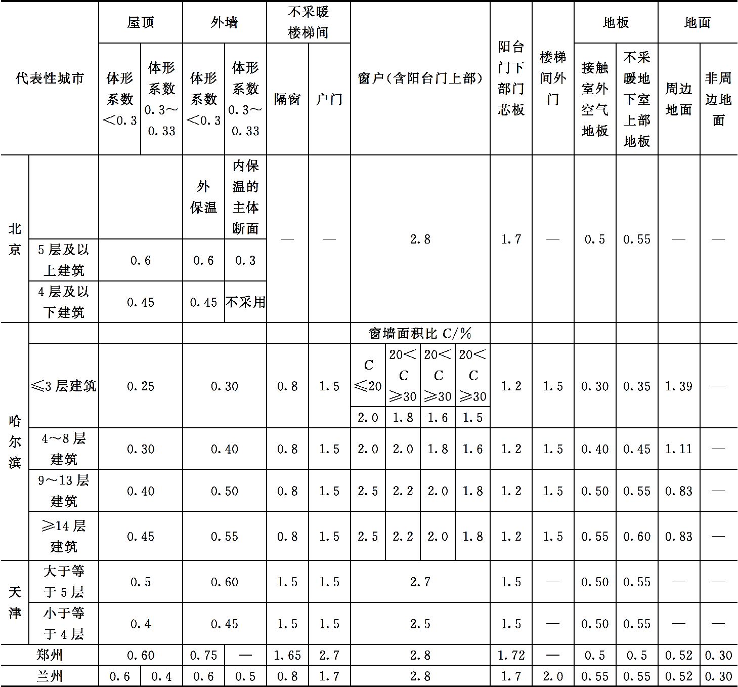 注:1.表中外墙传热系数限值系指考虑了周边热桥影响后的外墙平均传热系数。有些地区外墙传热系数限值有两行数据,上行数据与传热系数为4·70W/(m2。K)的单层塑料窗相对应;下行数据与传热系数为4·00W/(m2。K)的单框双玻金属窗相对应。