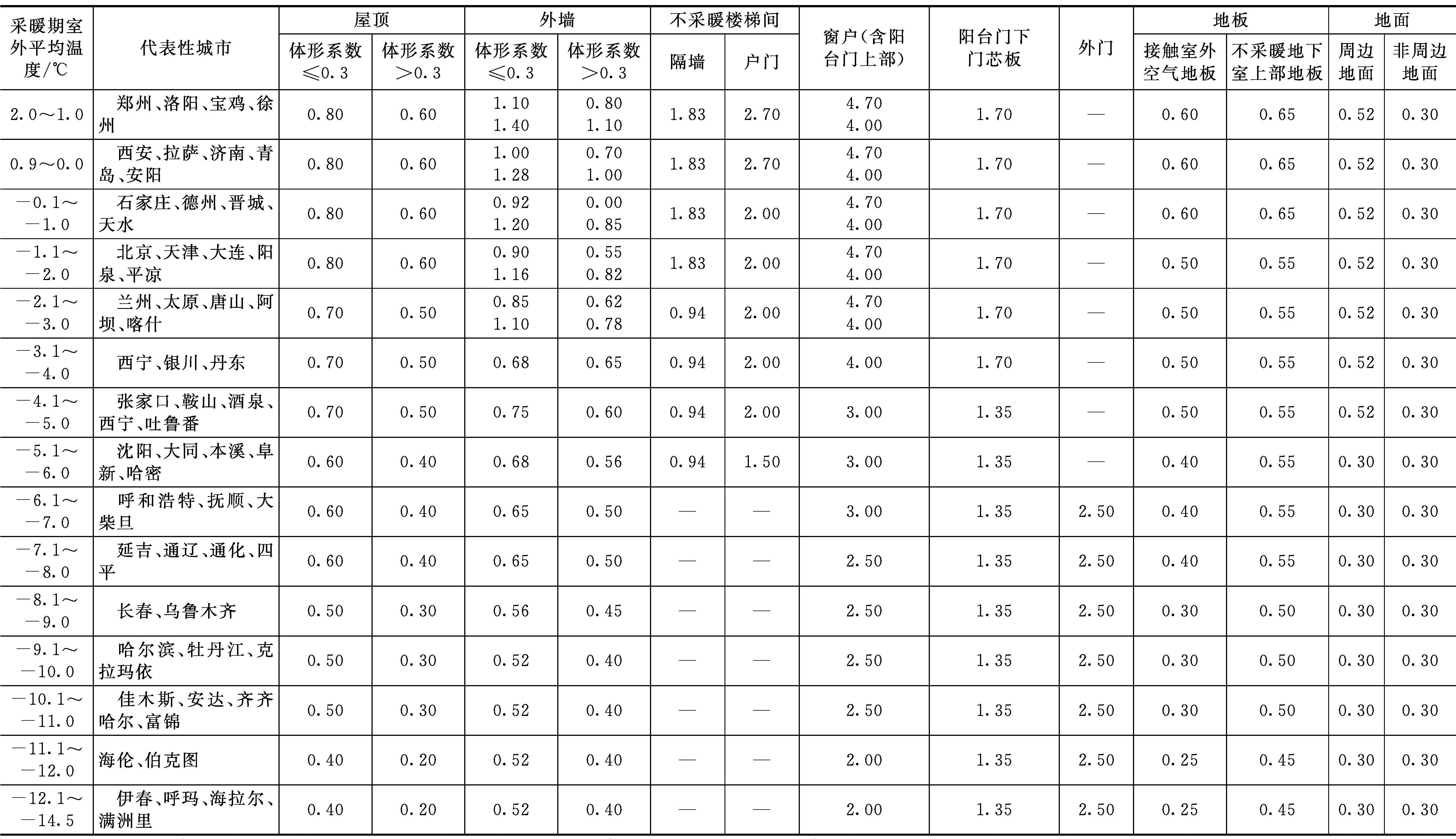 按照我国目前建筑节能65%目标设计要求,不同地区采暖居住建筑各部分围护结构的传热系数不应超过表1-1中规定的数值。当实际采用的窗户传热系数比表1-1规定的限值低0.5及大于0.5时,在满足本标准规定的耗热量指标条件下,可按照现行行业标准《严寒和寒冷地区居住建筑节能设计标准》(JGJ 26—2010)中规定的方法,重新计算确定外墙和屋顶所需的传热系数。