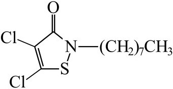 为了抑制船体污垢的生成,常采用的方法是在船壳上使用含有机锡化合物的防污剂。这类化合物虽然具有很好的防污效果,但是它会产生广泛的环境问题,对不结垢的水生物种如淡菜、蛤等有极大的毒性,能使海洋动物慢性中毒,降低海洋生物的再生能力。除此之外,它们在环境中不易降解,可以通过生物富集作用危害海洋生态环境,甚至人类健康。目前,全世界均已放弃使用。基于对新的船体防污涂料的需要,Rohm&Haas公司开发出一种可降解的新型防污剂——4,5-二氯-2-正辛基-4-异噻唑啉-3酮,称为“海洋9号(Sea-Nine TM )”,其结构式如下所示: