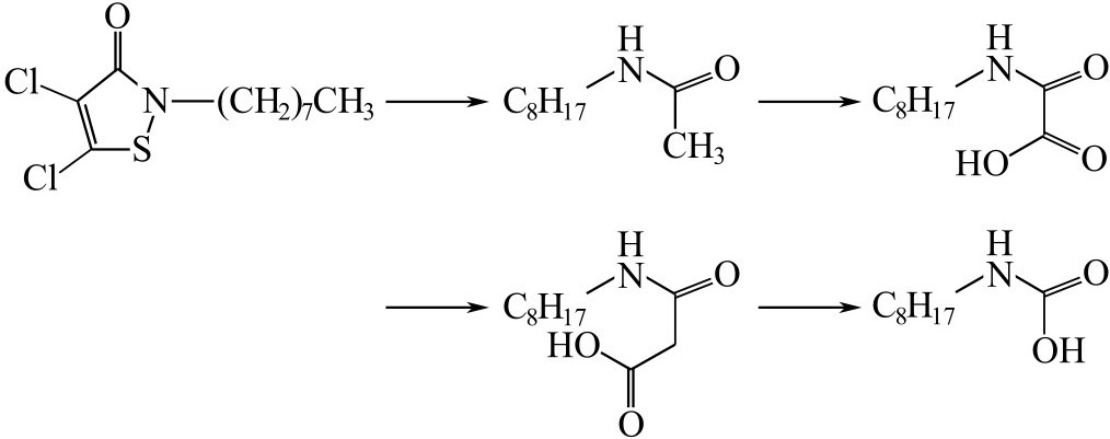 经实海测验,该物质的防污性能优良且毒副作用小。而且由于它在海水中降解速率很快(在海水中半衰期为1d,在沉积物中仅需1h),不会产生累积效应,没有长期毒性,是真正环境友好型的防污涂料。其降解途径如下所示: gO4Gwxy6Tx9W6Ew15Hj1QcAHN2TsI/VhX3g1EN5RipW2y7TBSTfOUPZNDj7rxxul