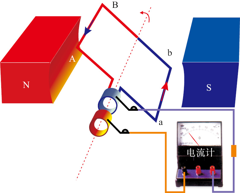 要注意的是这种切割磁力线的运动可以是导体相对磁体运动,也可以是磁体相对导体运动。图1-26所示为导体(线圈)在磁场中做切割磁力线运动产生感应电流。汽车的交流发电机就是利用电磁感应原理发电的。